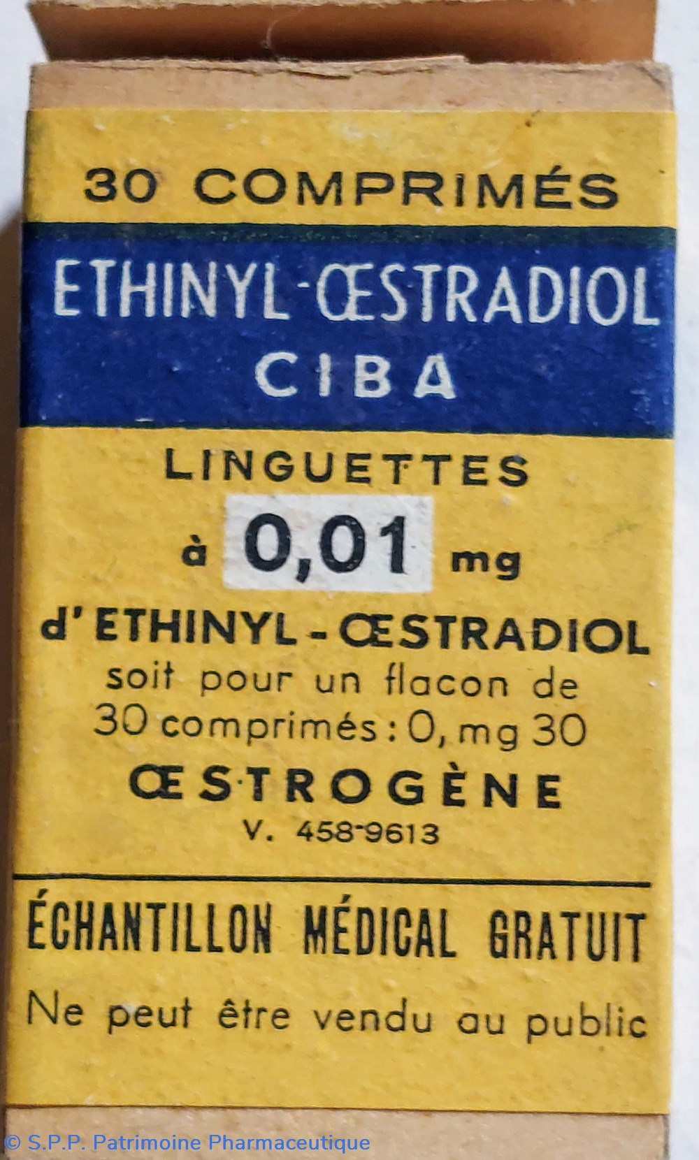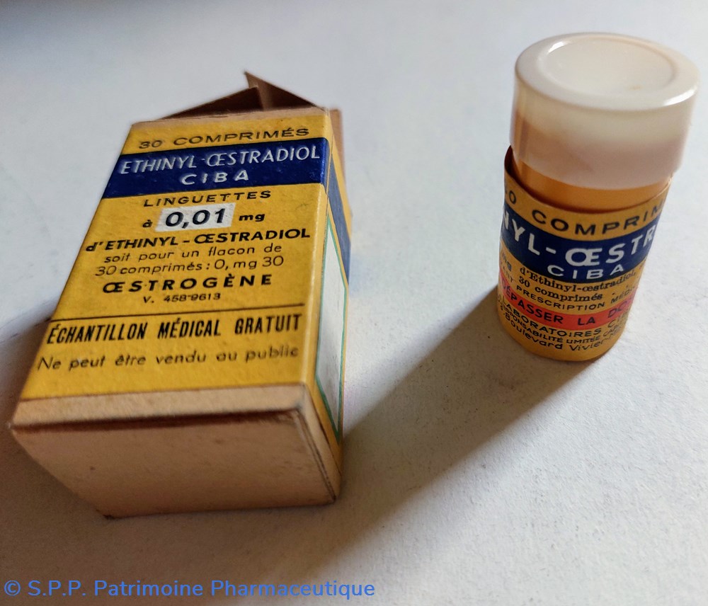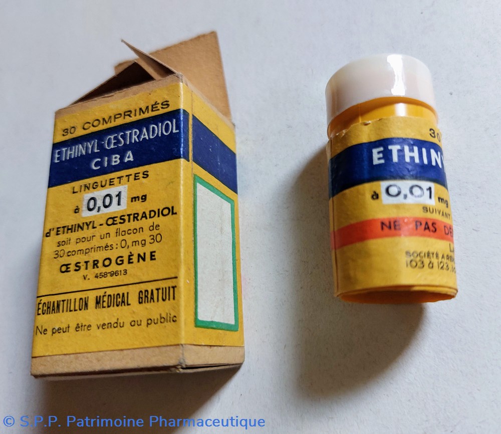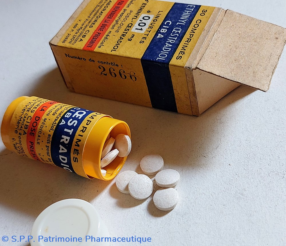 Petit tube hauteur 4 cm diamètre 2 cm contenant 30 comprimés D'ETHINYL ŒSTRADIOL. Linguettes à 0.01 mg