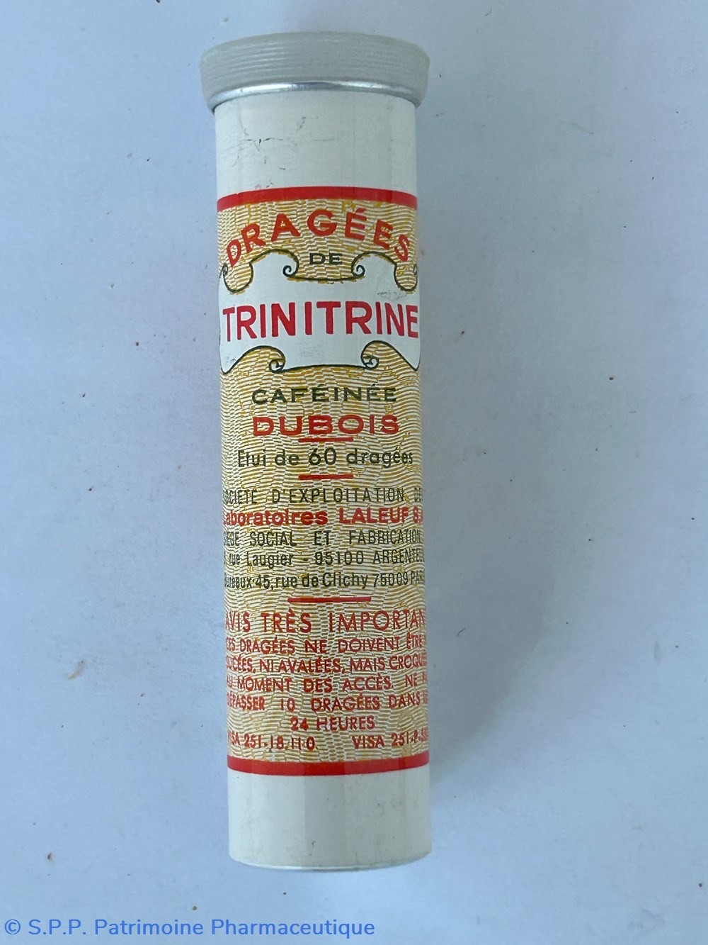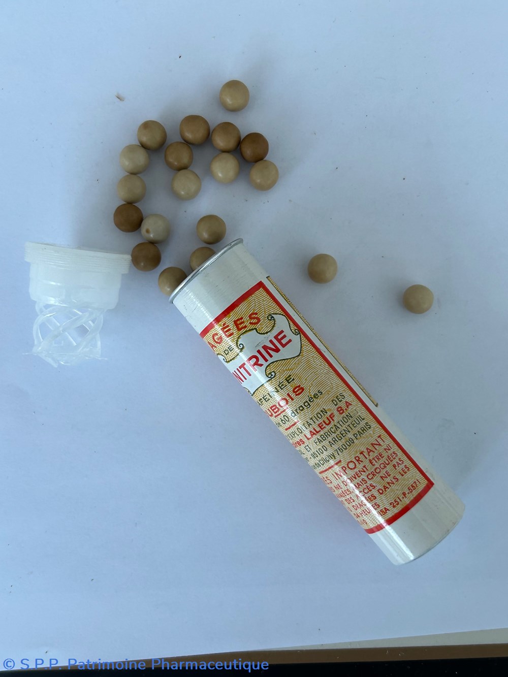 Tube cylindrique en métal (hauteur :9.5 cm diamètre : 2.5 cm) fermé par un bouchon plastique. Le tube contient encore les dragées de couleur beige plus ou moins foncée..