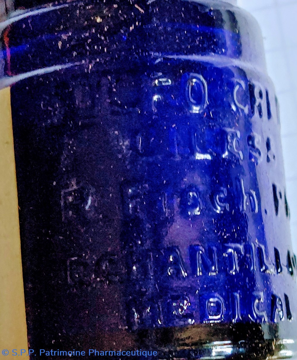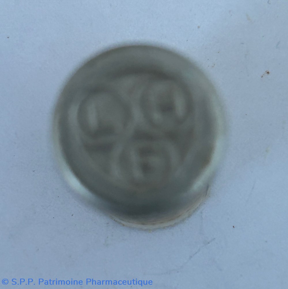 Le verre est gravé et mentionne le nom du produit, le nom du Laboratoire et la mention "Échantillon médical" Le dessous du pot est également gravé.
