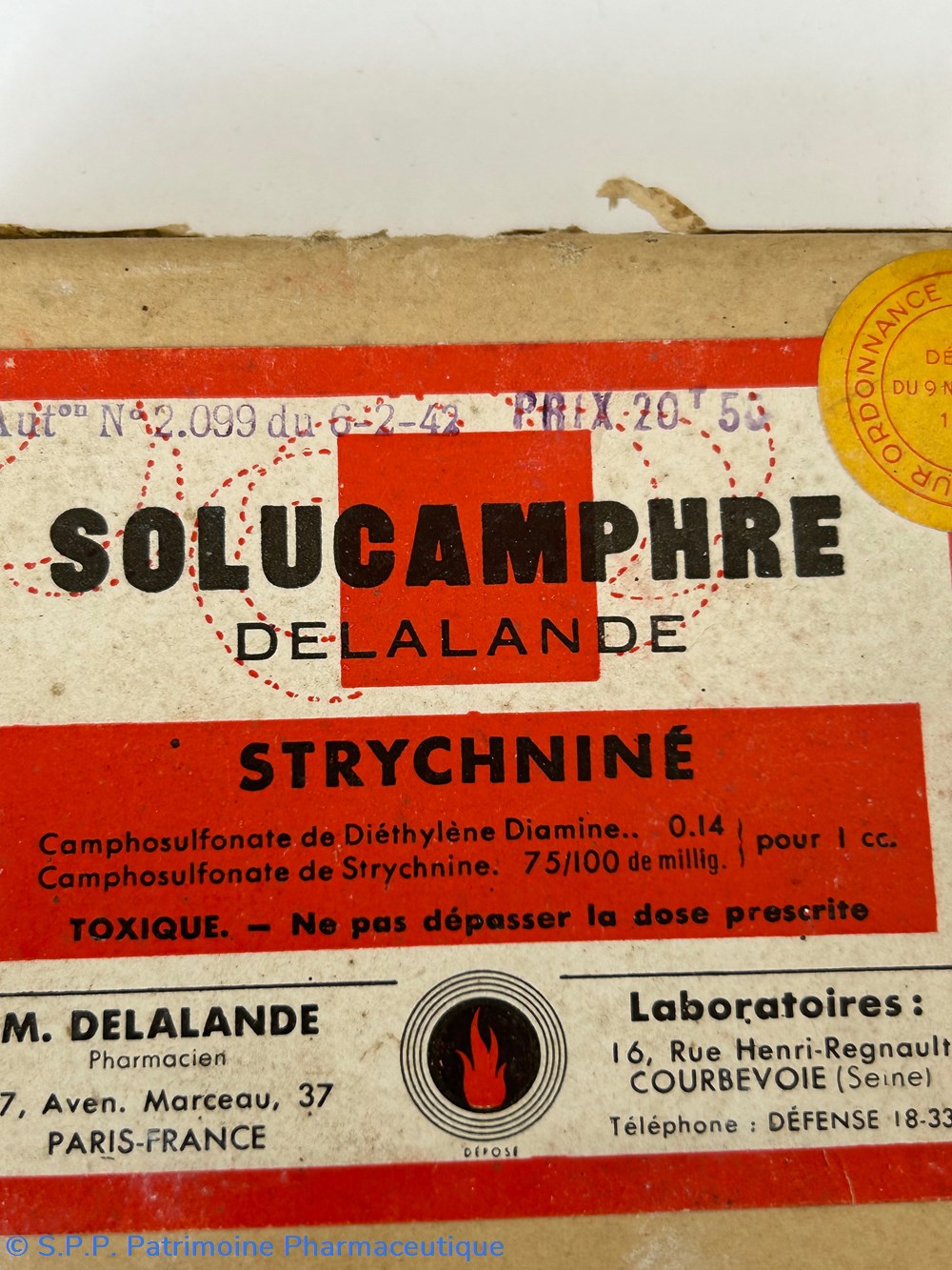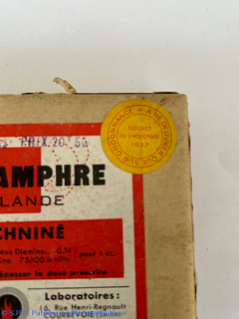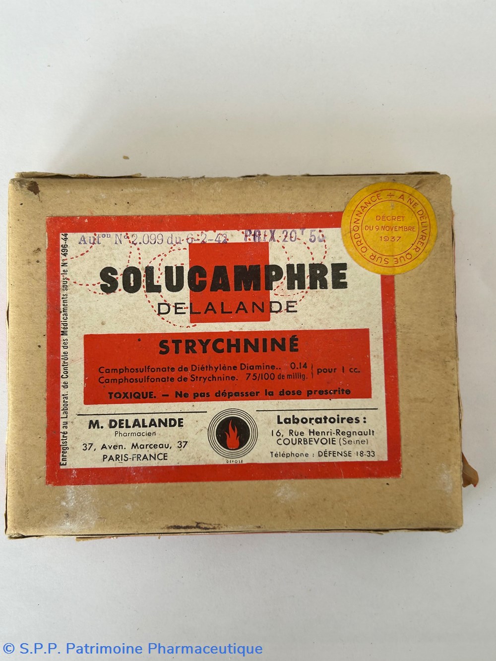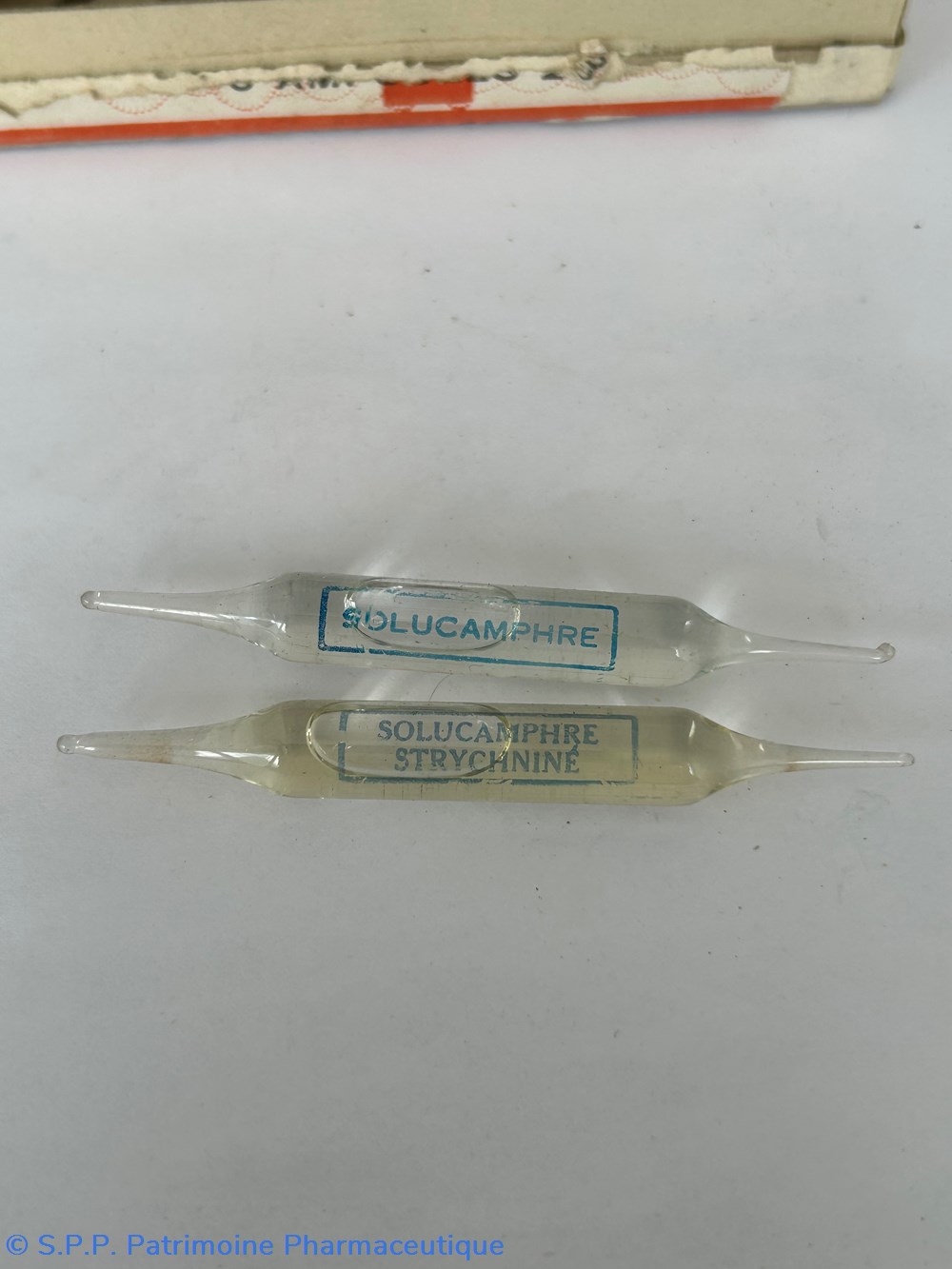 Petite boîte en carton de forme parallélépipèdique s'ouvrant sur le dessus ( 12 x 9.5 x 2 cm )Contient encore des ampoules scéllées: 4 de 2cc portent la mention solucamphre strychniné et une autre de 2 cc également simplement solucamphre. Une autre ampoule de contenance plus importante et portant la mention Solucamphre est également présente dans la boîte