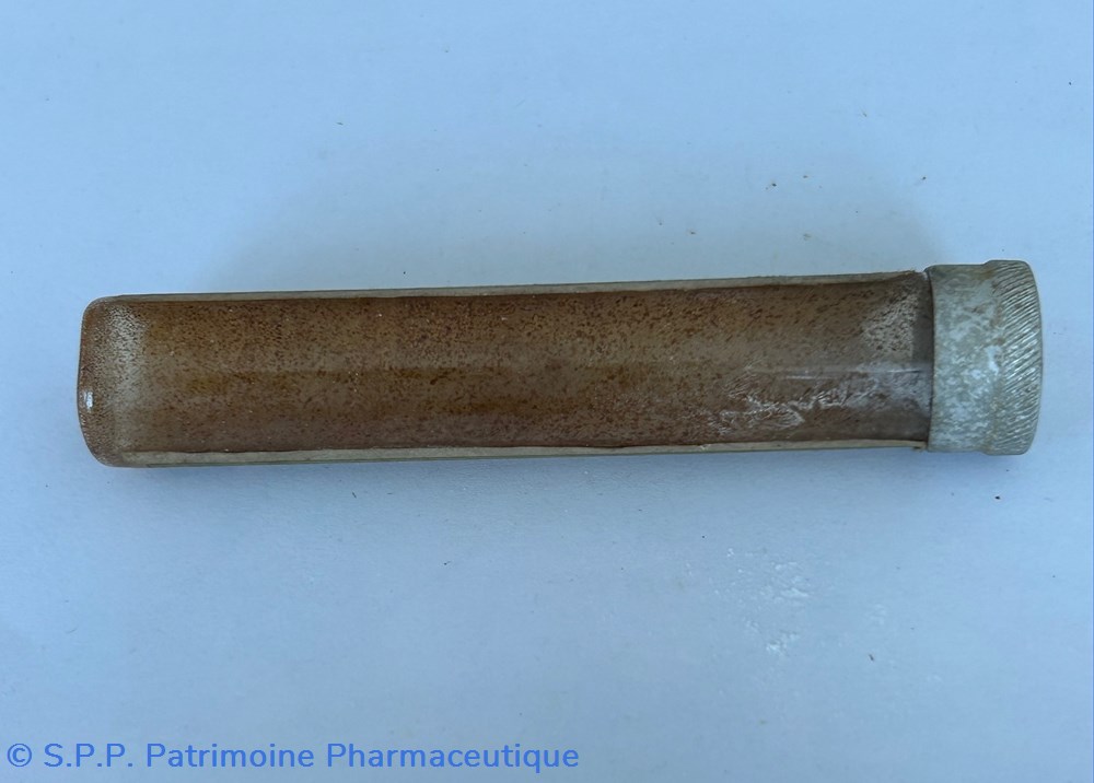 Petit tube vide en verre ambré ( Hauteur : 9 cm Diamètre : 1.5 cm ) fermé par un bouchon en aluminium où est inscrit "Usines du Rhône"