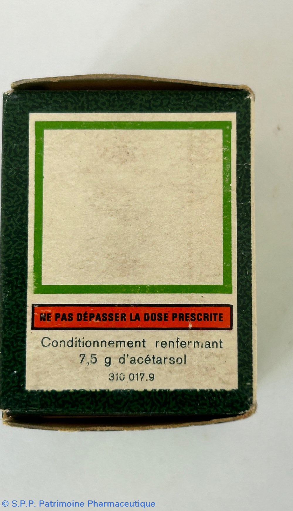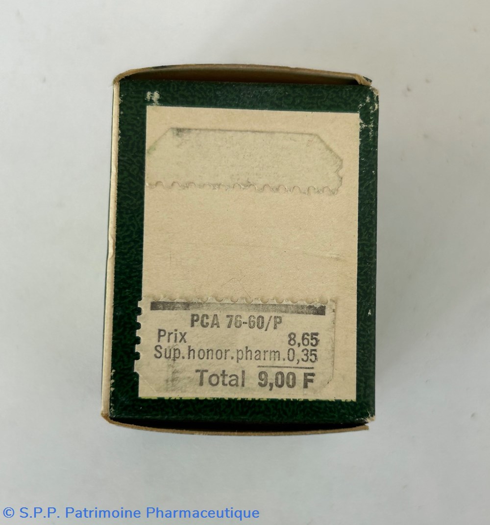Petite boîte en carton de forma parallélépipèdique ( 4.5 x 3.5 x 3.5 cm ) contenant un petit flacon en verre fermée par un bouchon de plastique transparent et une notice explicative. Le flacon contient encore les comprimés d'origine.
