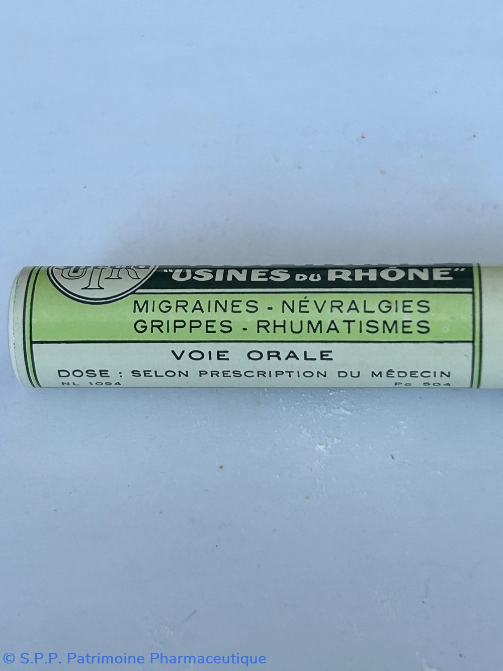 Petit tube en métal fermé par un bouchon en plastique vert ( Hauteur ; 7 cm Diamètre 1.5 cm ). Des comprimés sont encore à l'intérieur du tube