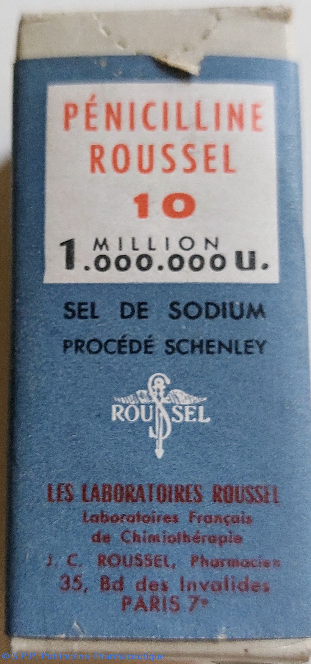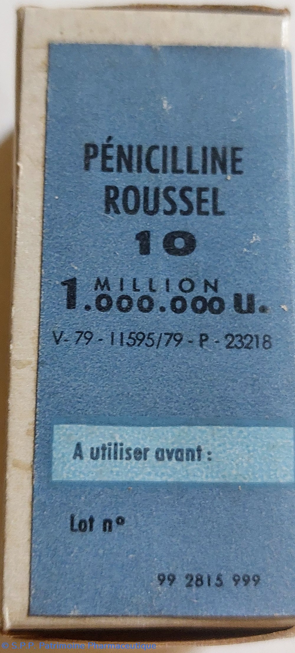 Petite boîte en carton 6.5*2.8*2.8 cm scellée d'origine contenant PÉNICILLINE "G" cristallisée stabilisée ROUSSEL 10- 1000.000 U