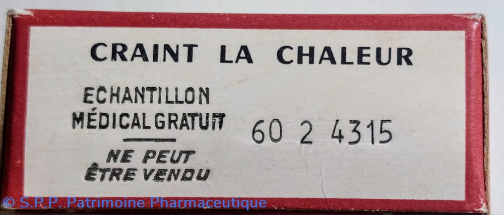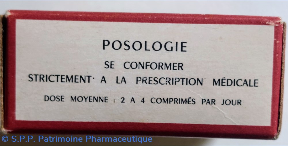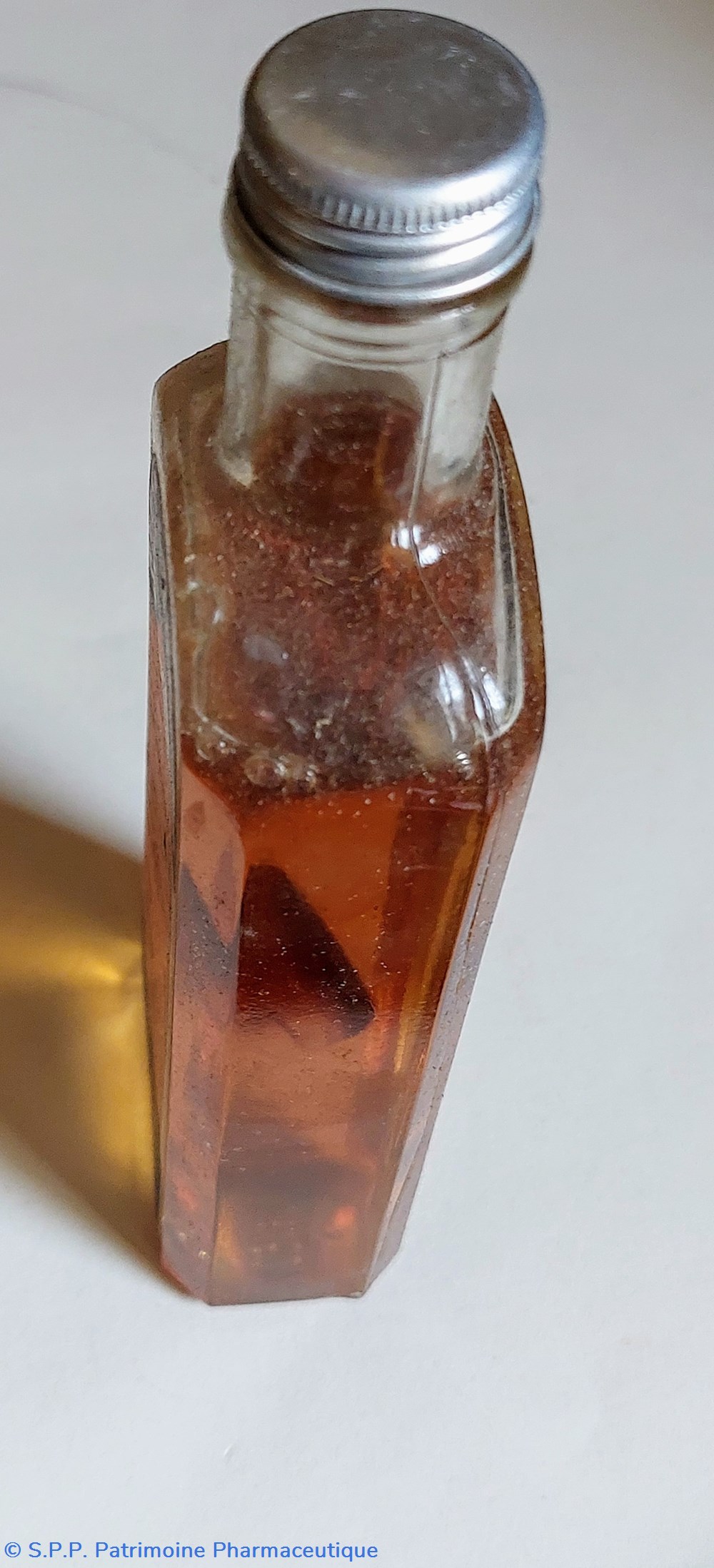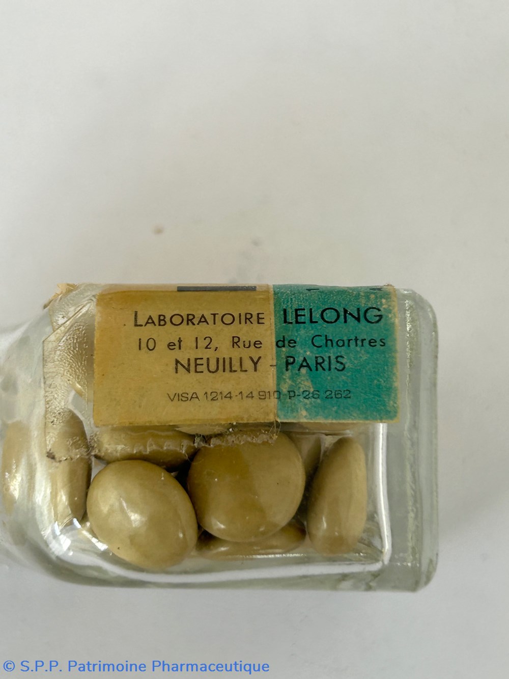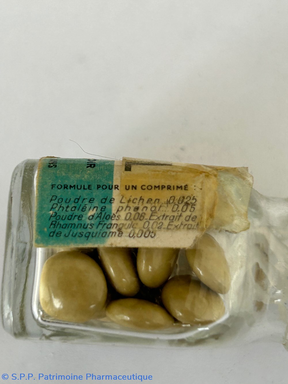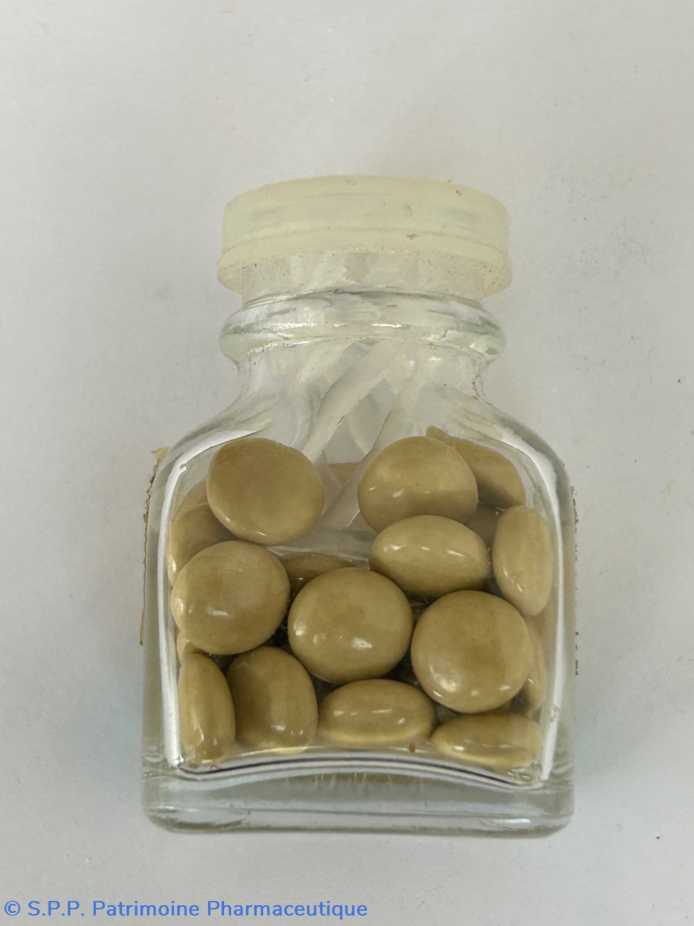 Petit flacon en verre avec un bouchon en plastique contenant encore des comprimés dragéifiés. Certainement ce flacon devait ête placé originellement dans une boîte en carton. Hauteur du flacon : 5,5 cm largeur : 3.5 cm épaisseur : 2.5 cm.