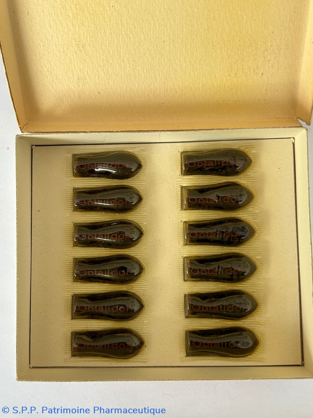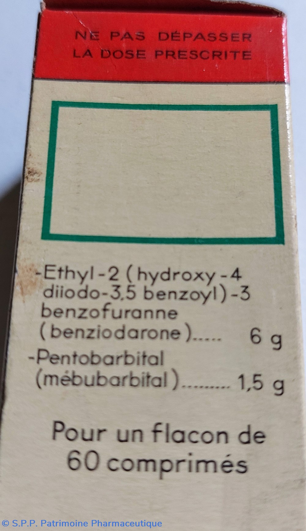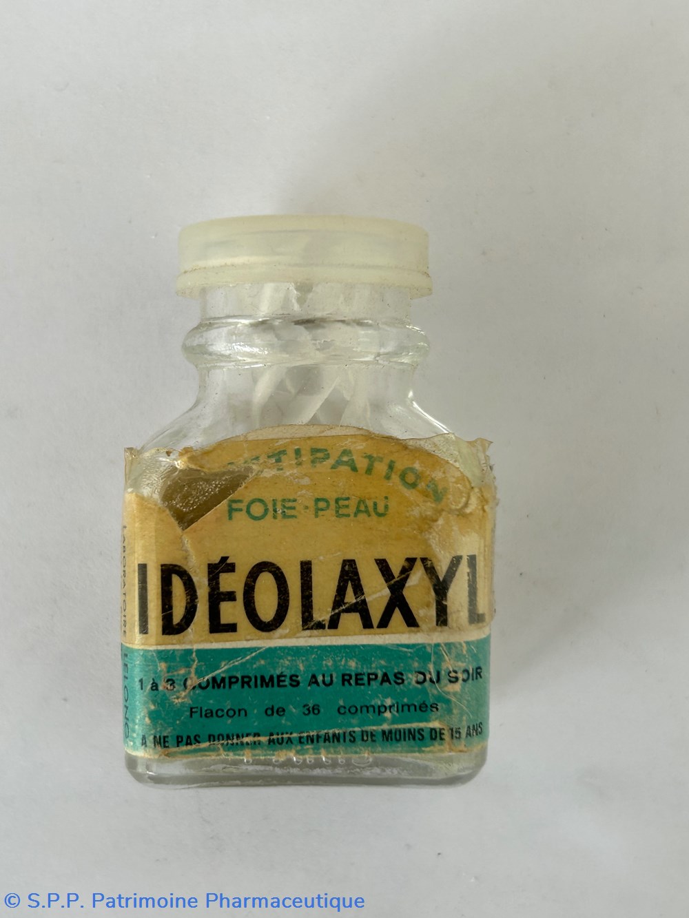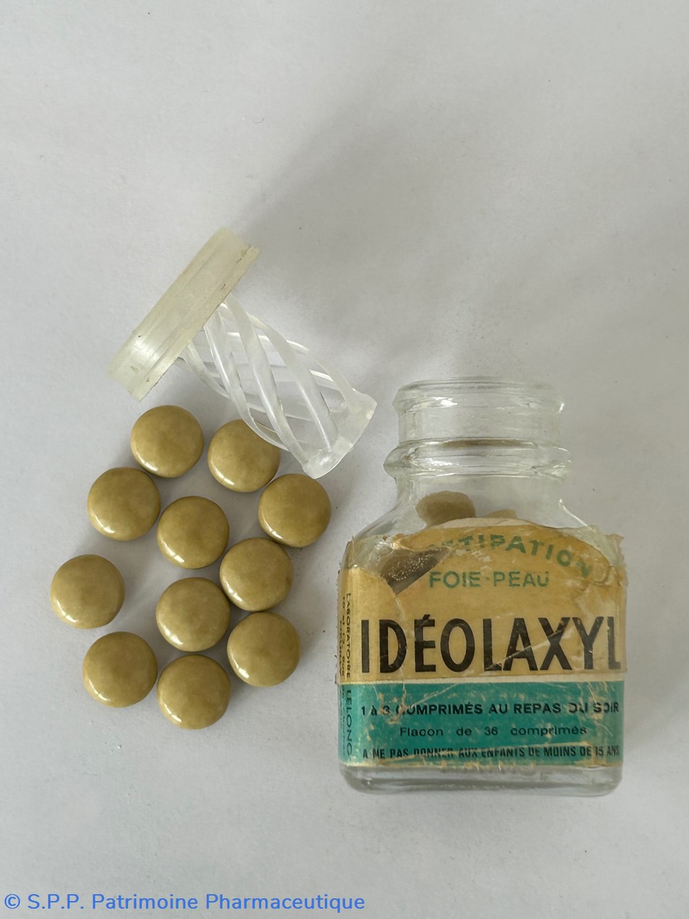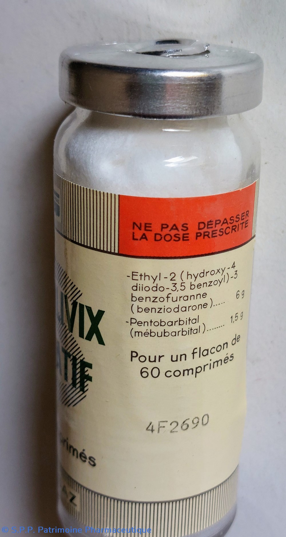 Petit flacon en verre avec un bouchon en plastique contenant encore des comprimés dragéifiés. Certainement ce flacon devait ête placé originellement dans une boîte en carton. Hauteur du flacon : 5,5 cm largeur : 3.5 cm épaisseur : 2.5 cm.