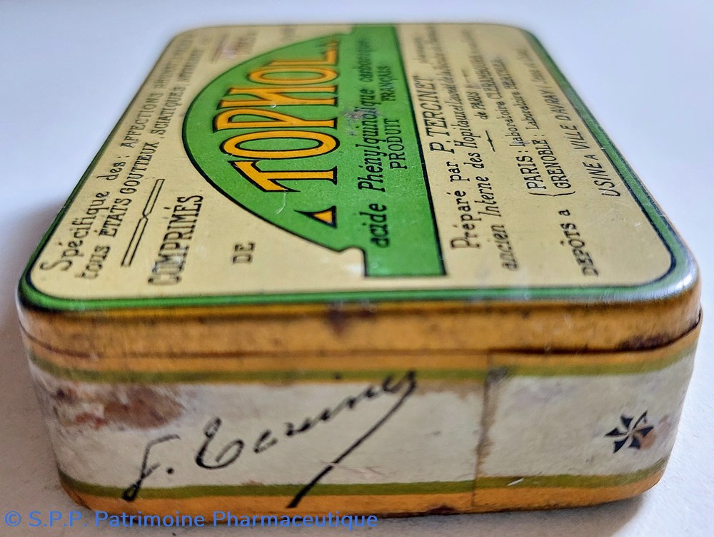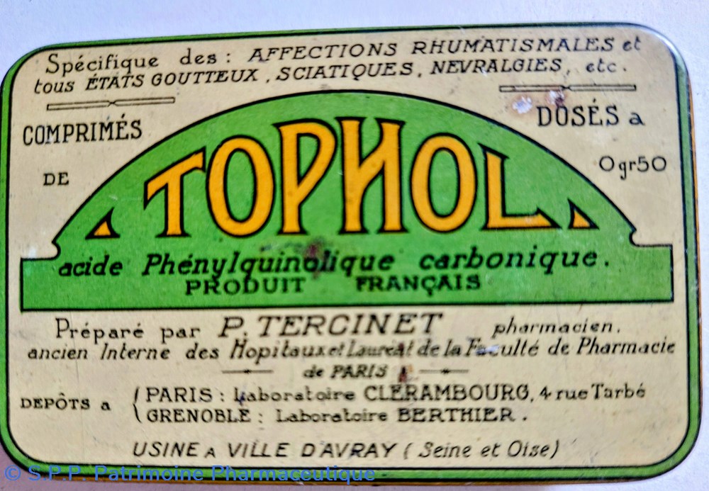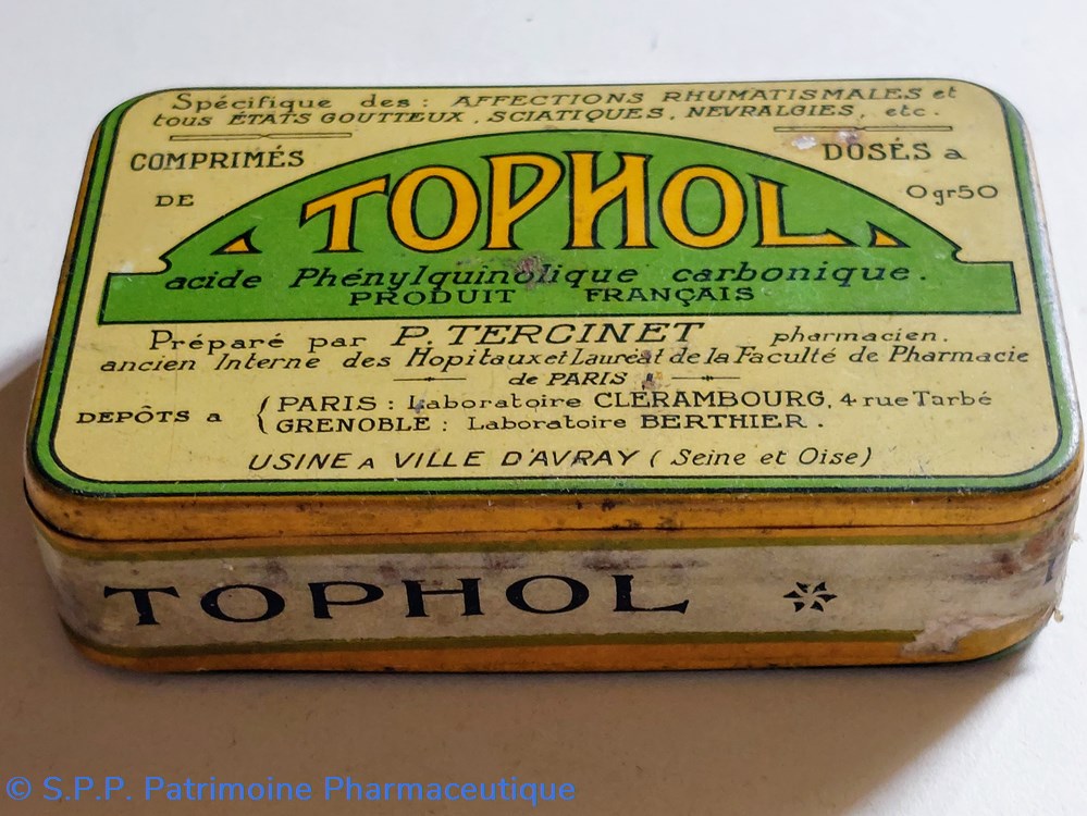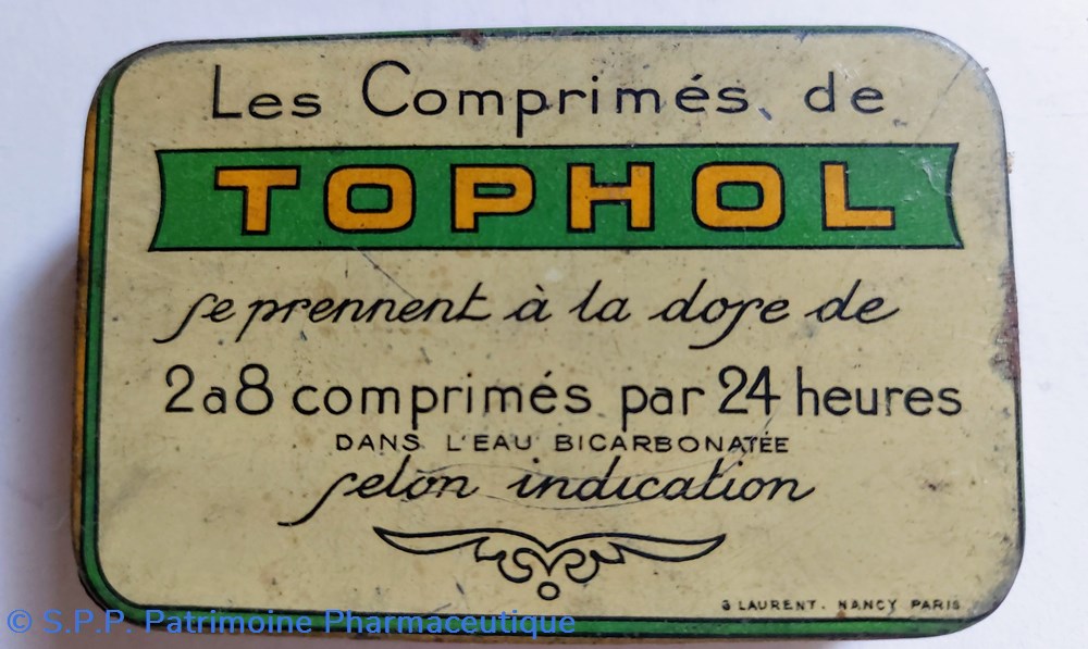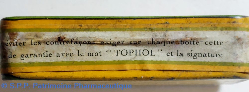 Boîte métallique scellée d'origine 8*5*2 cm contenant des Comprimés TOPHOL dosés à 0gr 50.