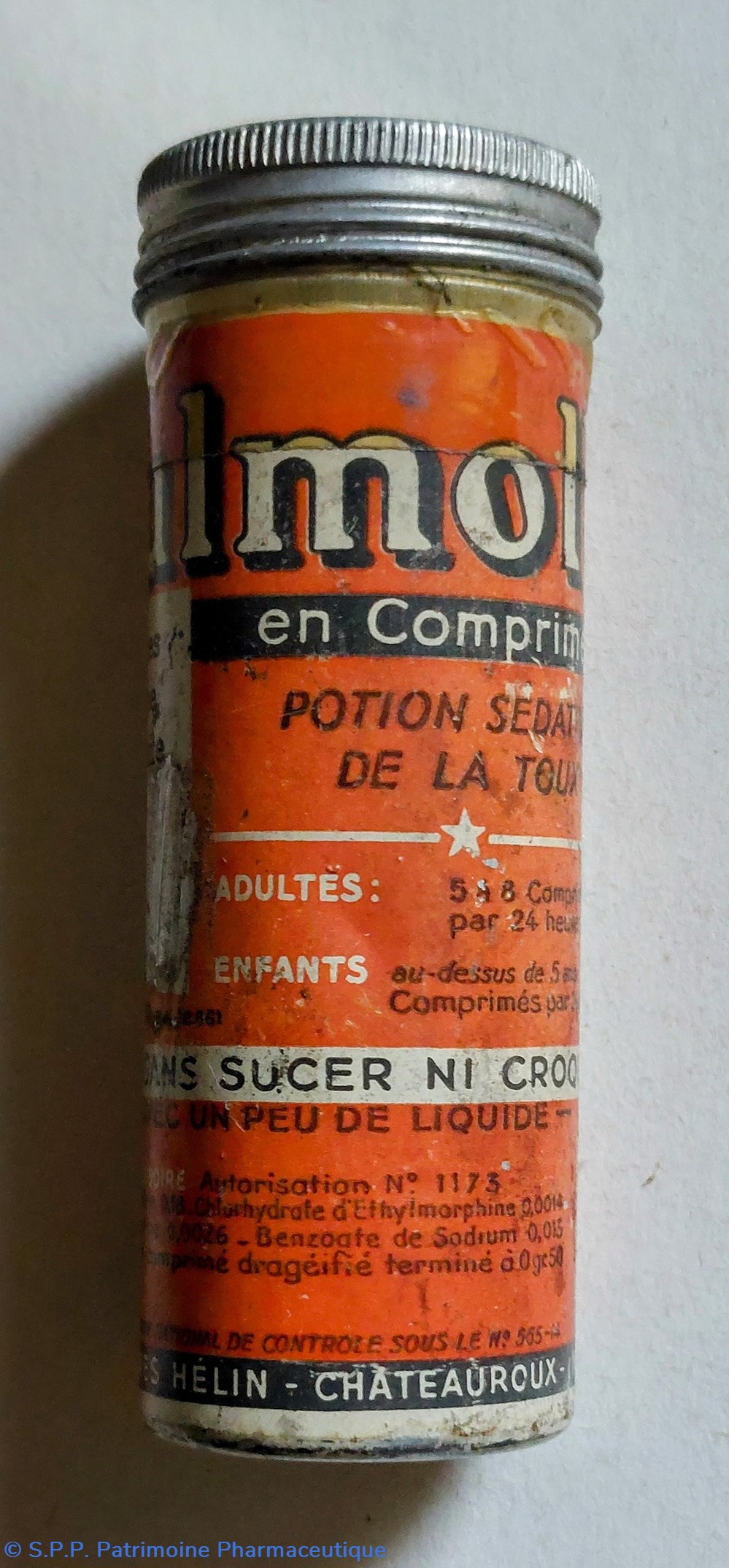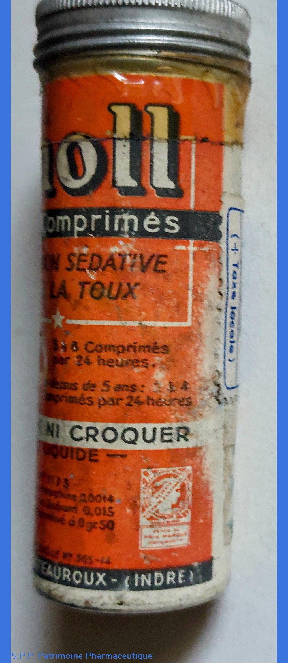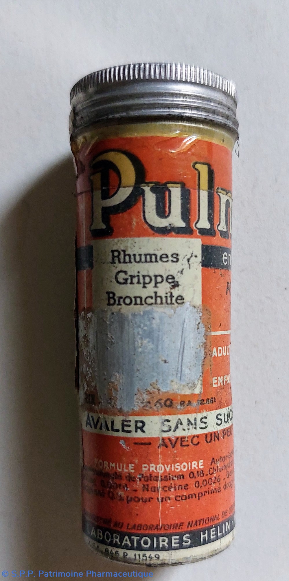 Tube métallique bouchon vissé et bloqué hauteur 6.3 diamètre 2.3 cm contenant des COMPRIMÉS PULMOLL " Potion Sedative de la toux" pour adultes et enfants ..... Un deuxième tube identique " Formule provisoire" à 110 Fr