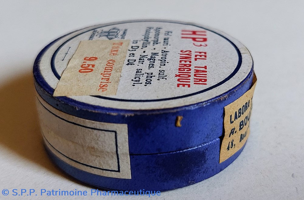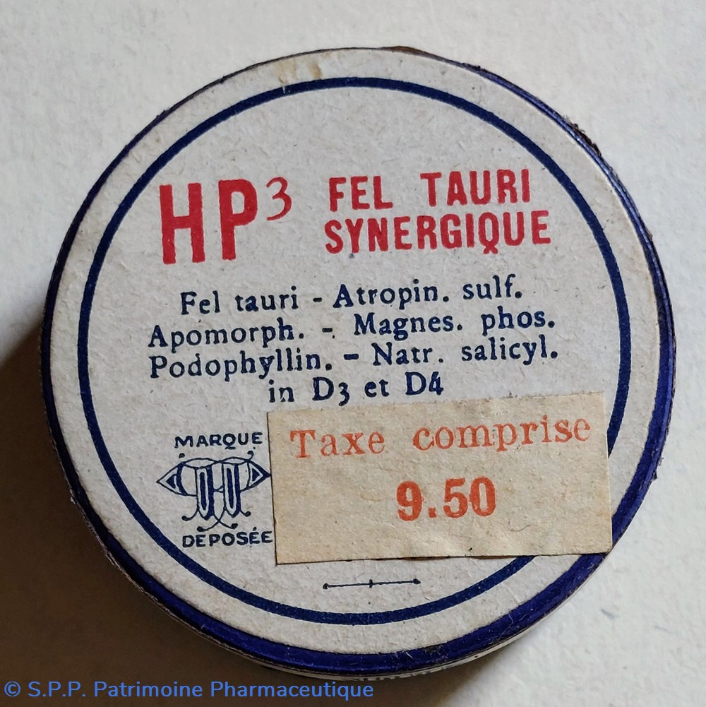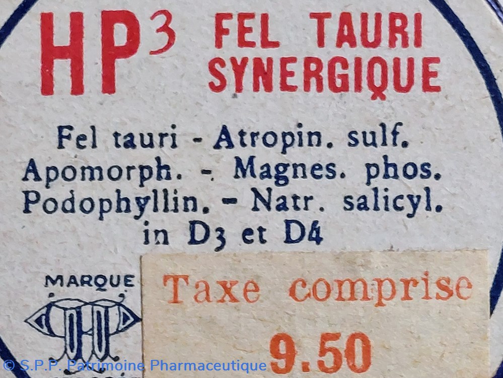 Composition FEL tauri, Atropine, Sulf. Apomorph., Magnésie, phos, Podophyllin, Natr. salicyl in D3 et D4