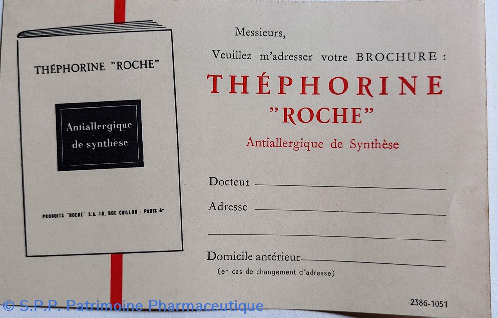 Carte postale permettant de se procurer une brochure THÉPHORINE " ROCHE" Antiallergique de synthèse