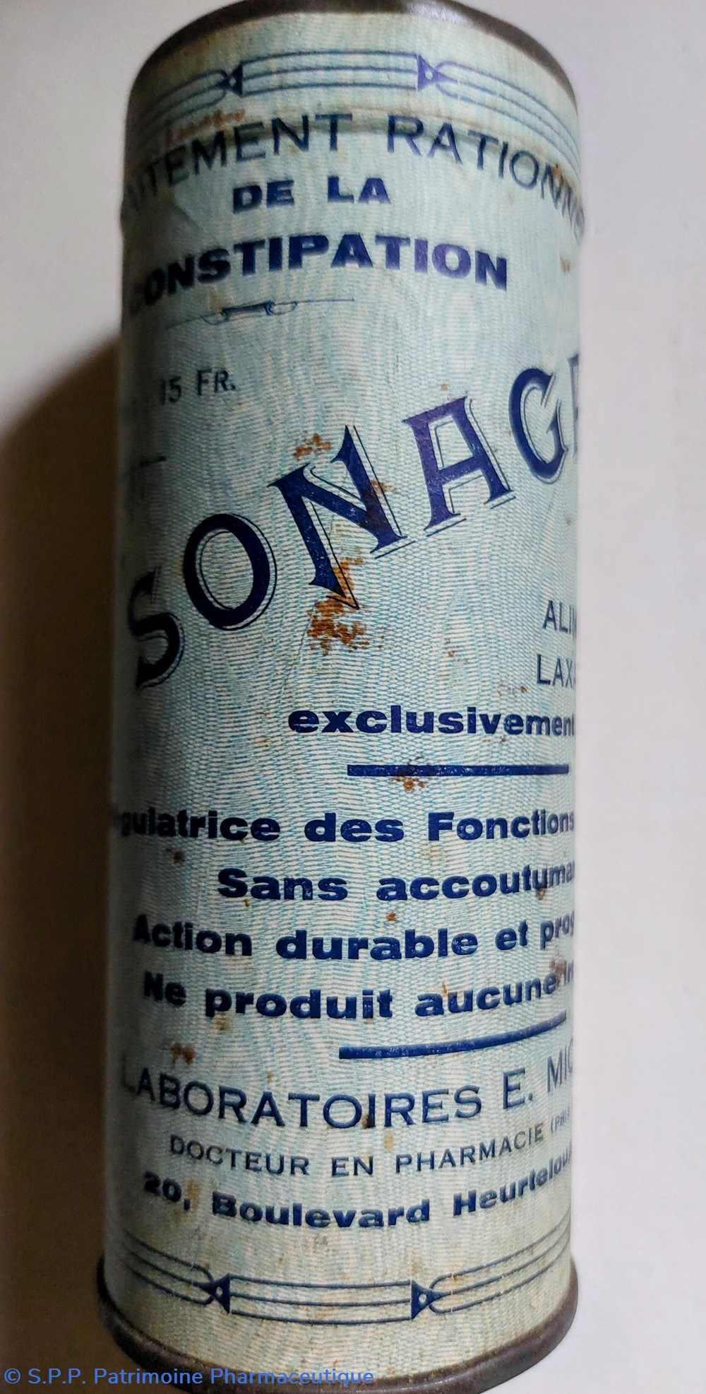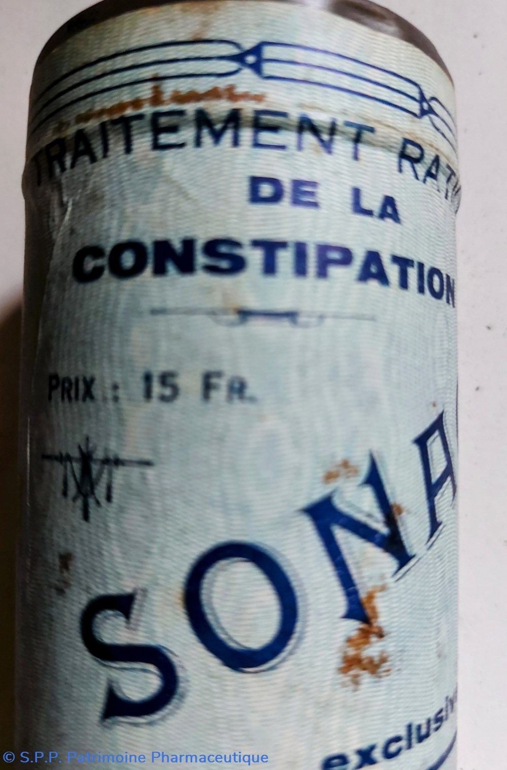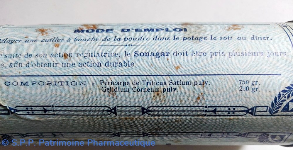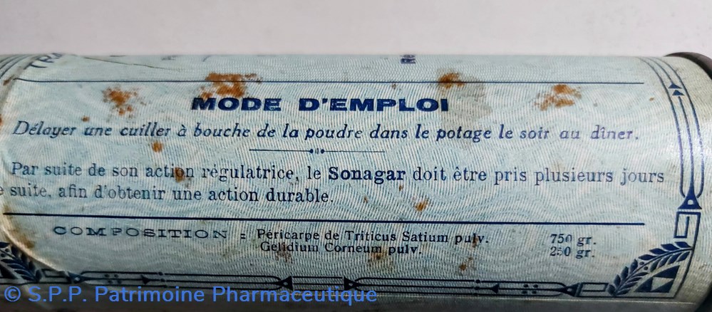 Tube métallique hauteur 14.5 diamètre 5.5 cm contenant un TRAITEMENT RATIONNEL DE LA CONSTIPATION SONAGAR en poudre alimentaire et laxative.