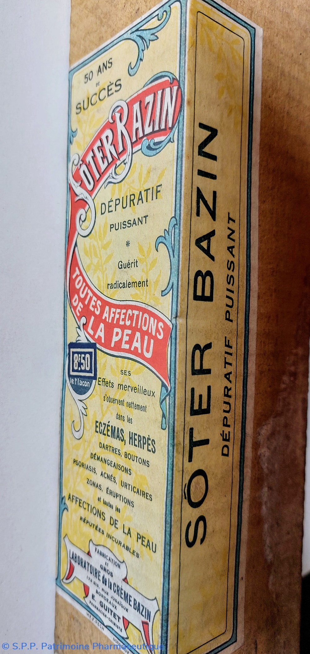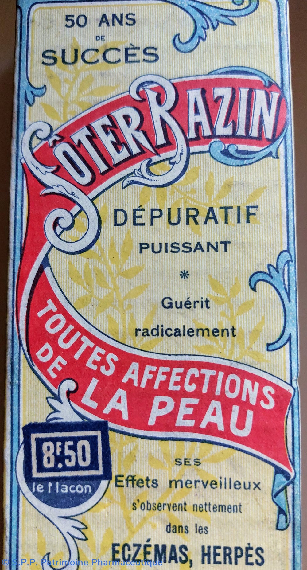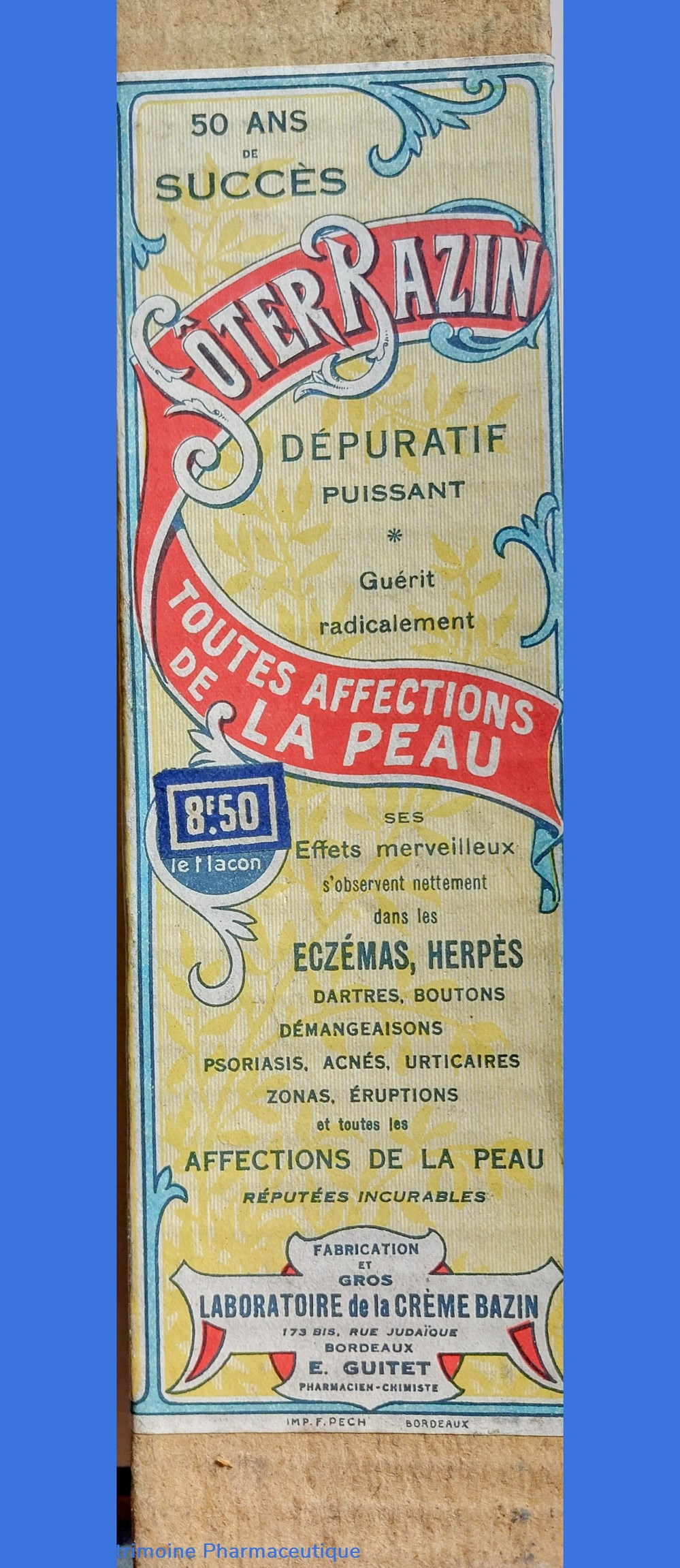 " Dépuratif puissant guérit radicalement toutes affections de la peau... Ses effets merveilleux s'observent nettement dans les Eczémas, Herpès, les dartres, les boutons, les démangeaisons, psoriasis, acnés, urticaires, zonas,..."