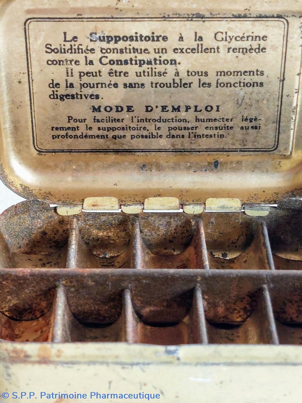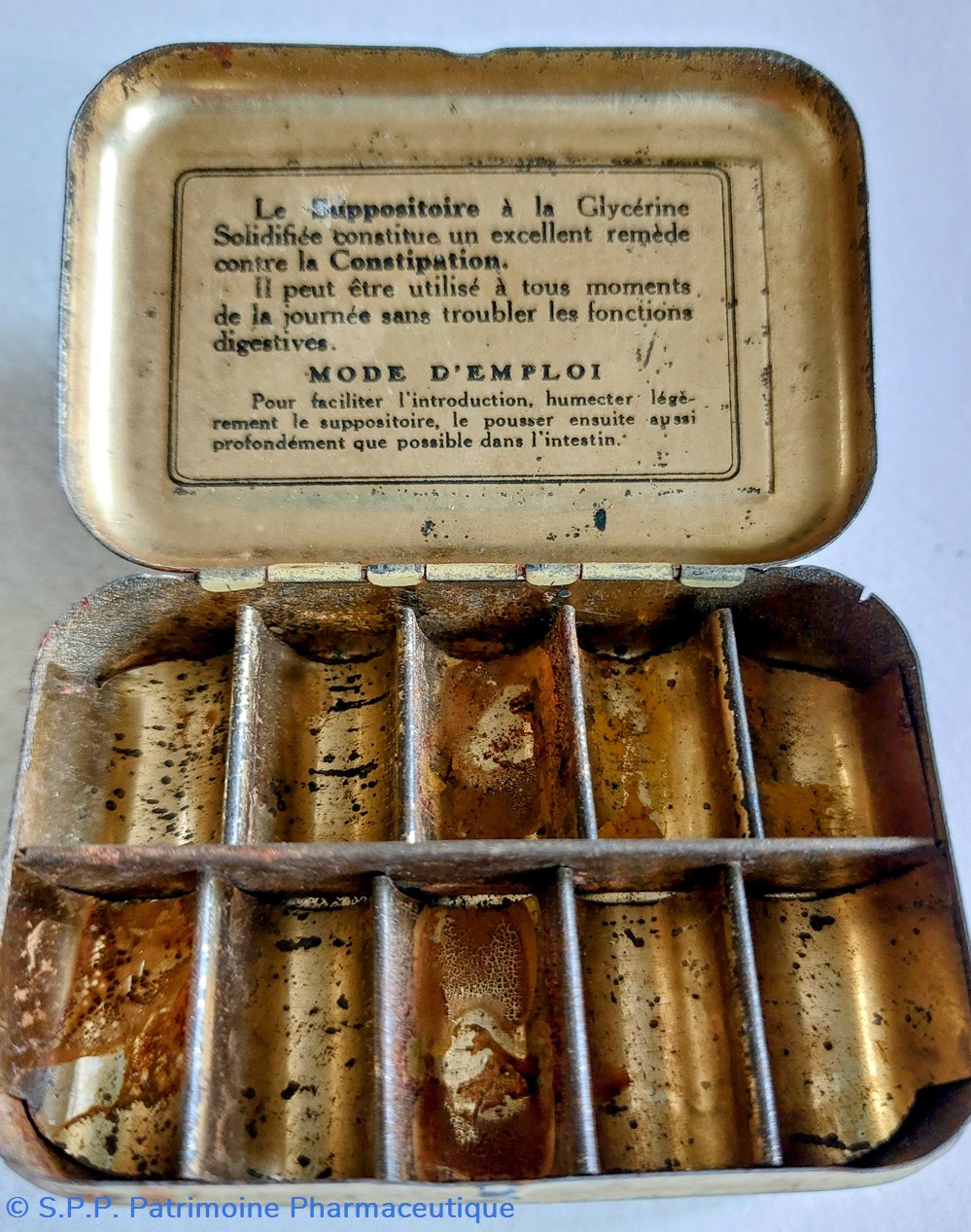 Boîte coffret métallique 7*4.5* 2 cm avec 10 compartiments vides ayant contenu des Suppositoires à la glycérine solidifiée pour enfants