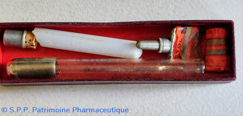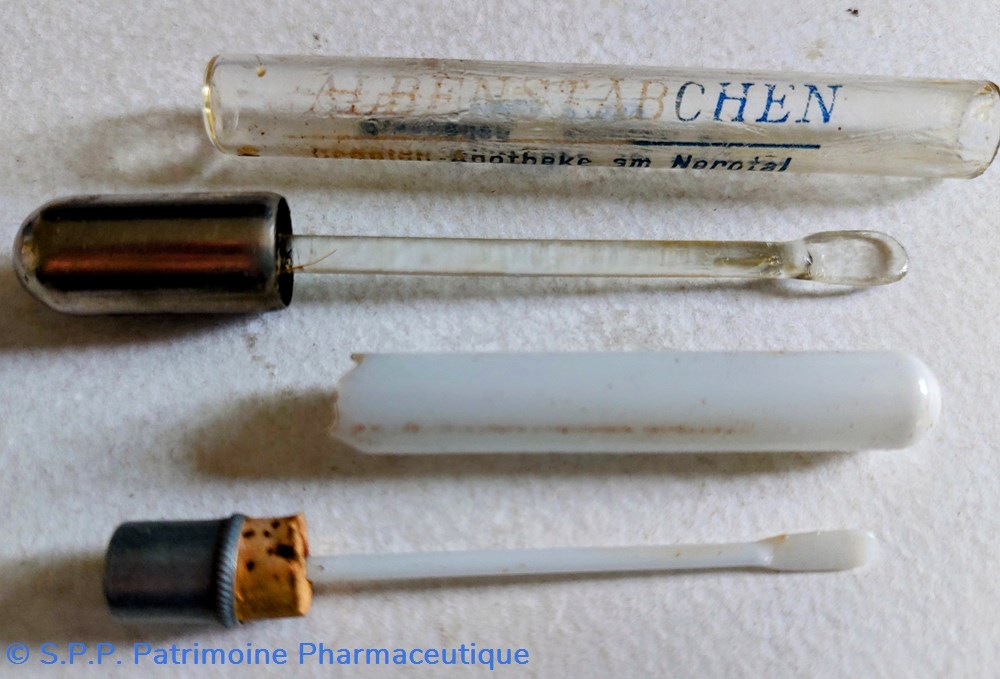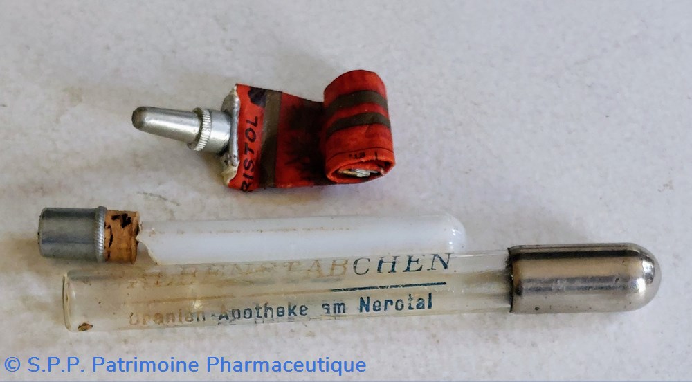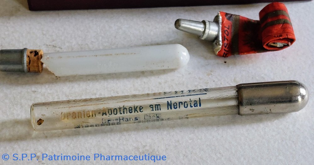 Un tube en verre transparent avec bouchon métallique prolongé d'un applicateur en verre. Marqué Drenien Apotheke am Nerotal Wiesbaden