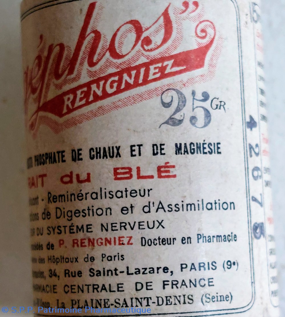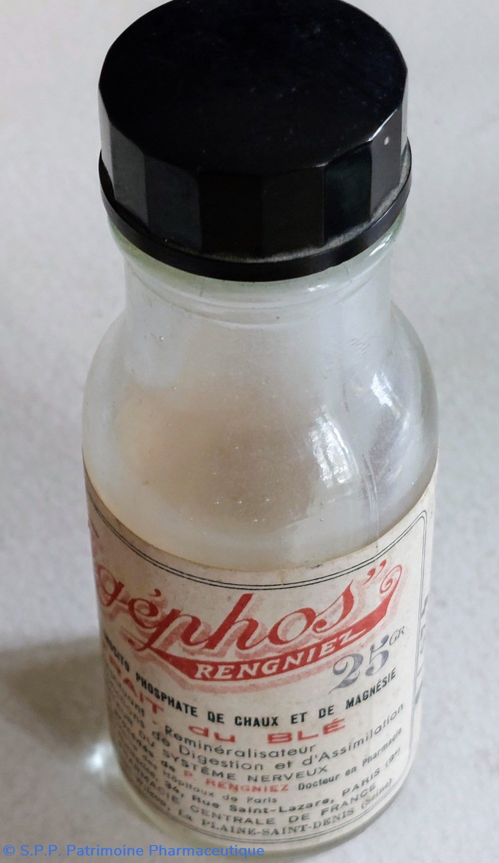 Flacon vide avec bouchon vissé en bakelite ayant contenu 25 gr de VÉGÉPHOS RENGNIEZ