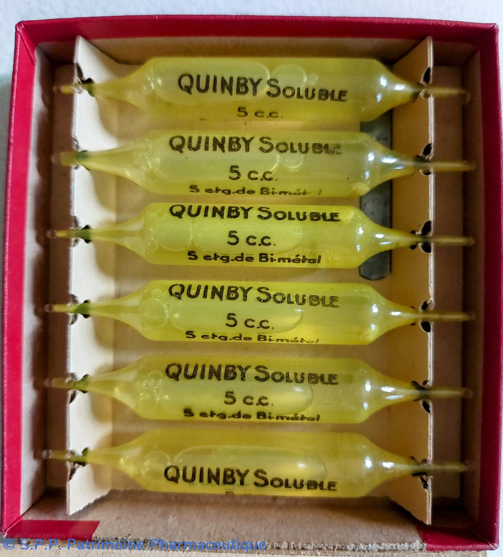 Coffret en carton (10*10.5* 2 cm) contenant 6 ampoules pour injections intramusculaires profondes de QUINBY SOLUBLE.