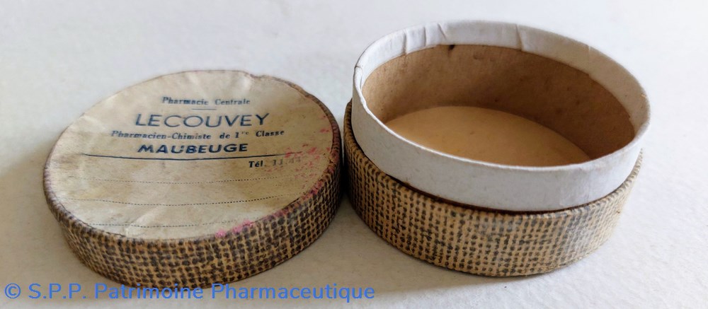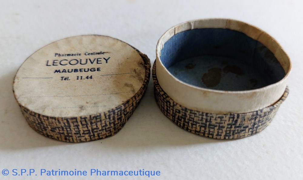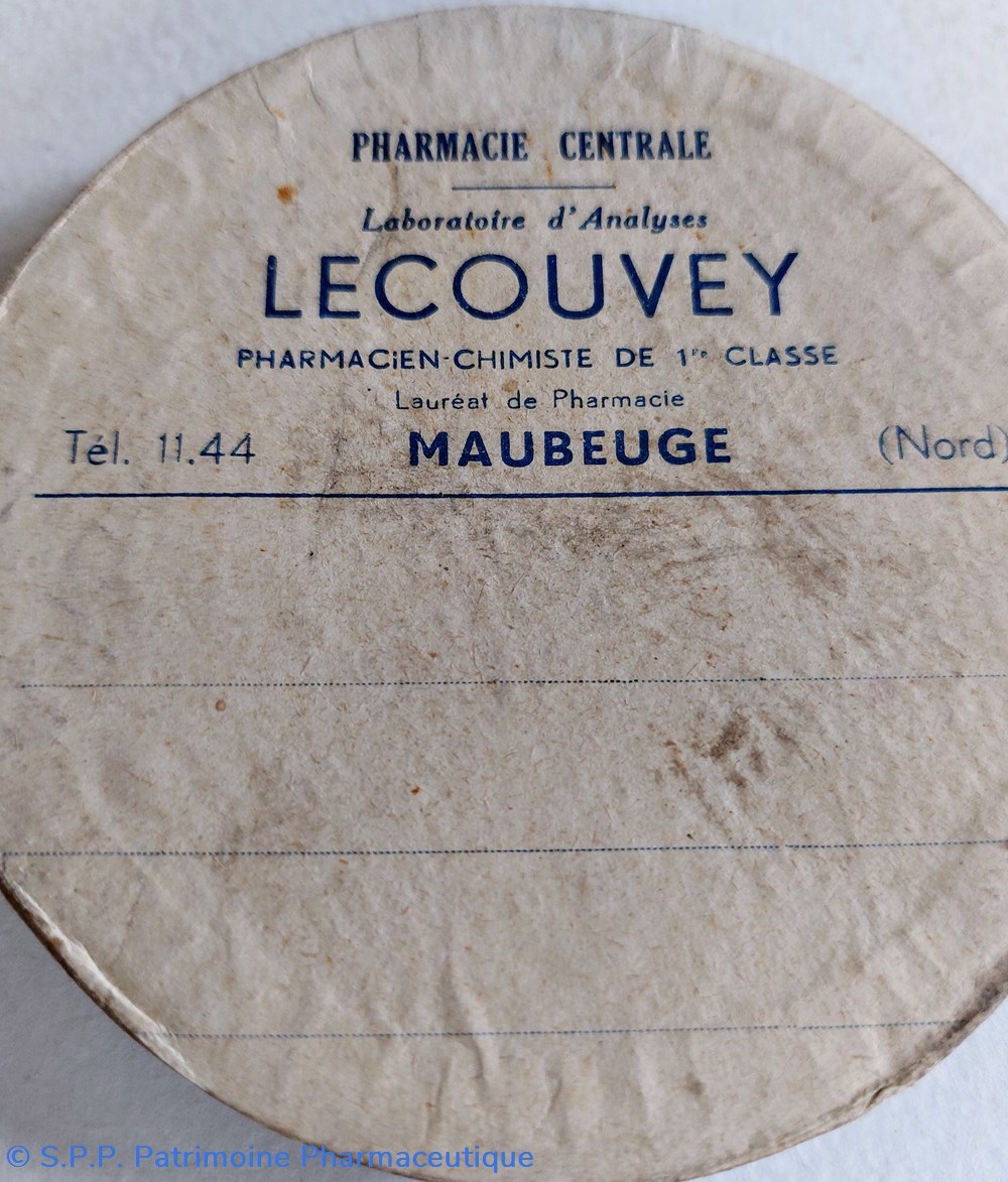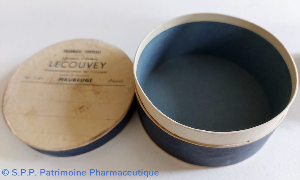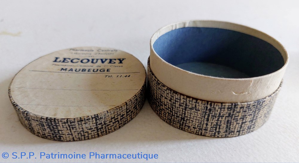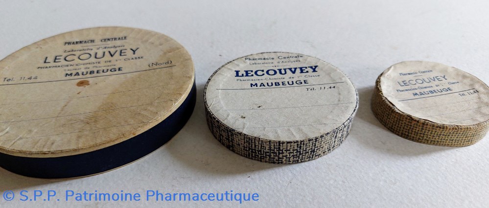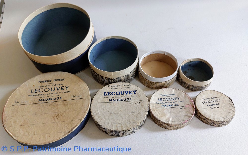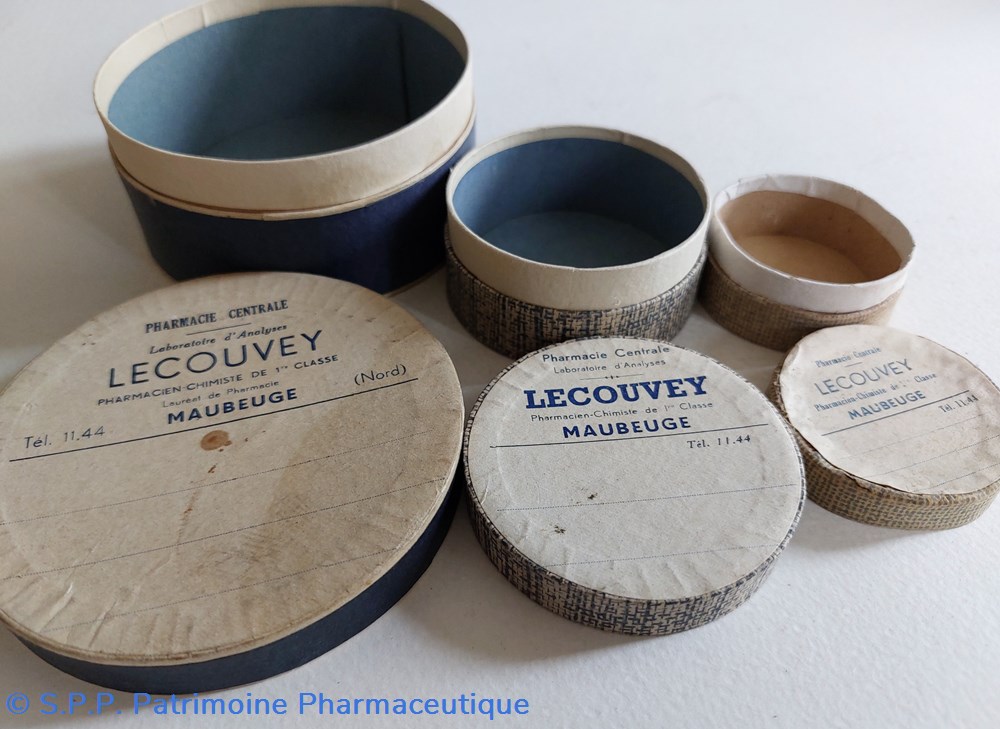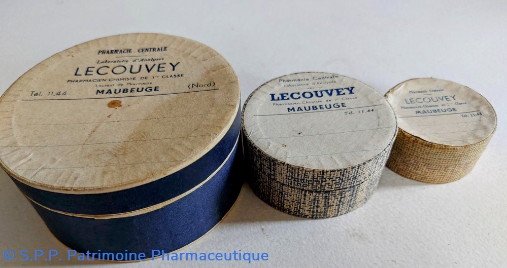 Quatre boîtes en carton étiquetées au nom de la Pharmacie LECOUVEY à Maubeuge