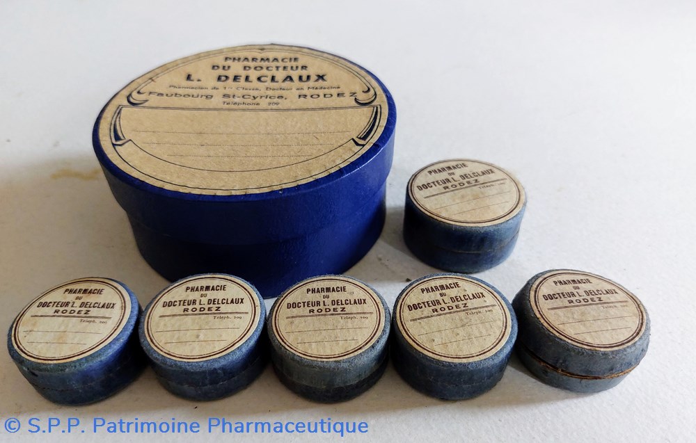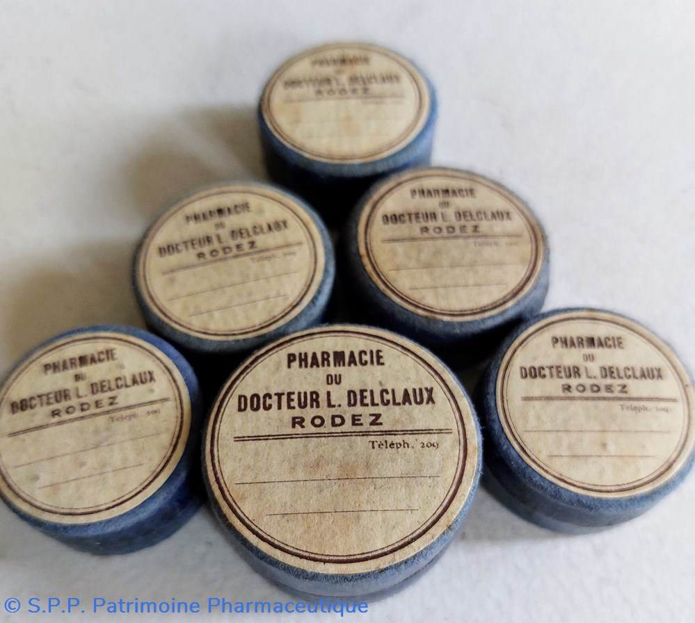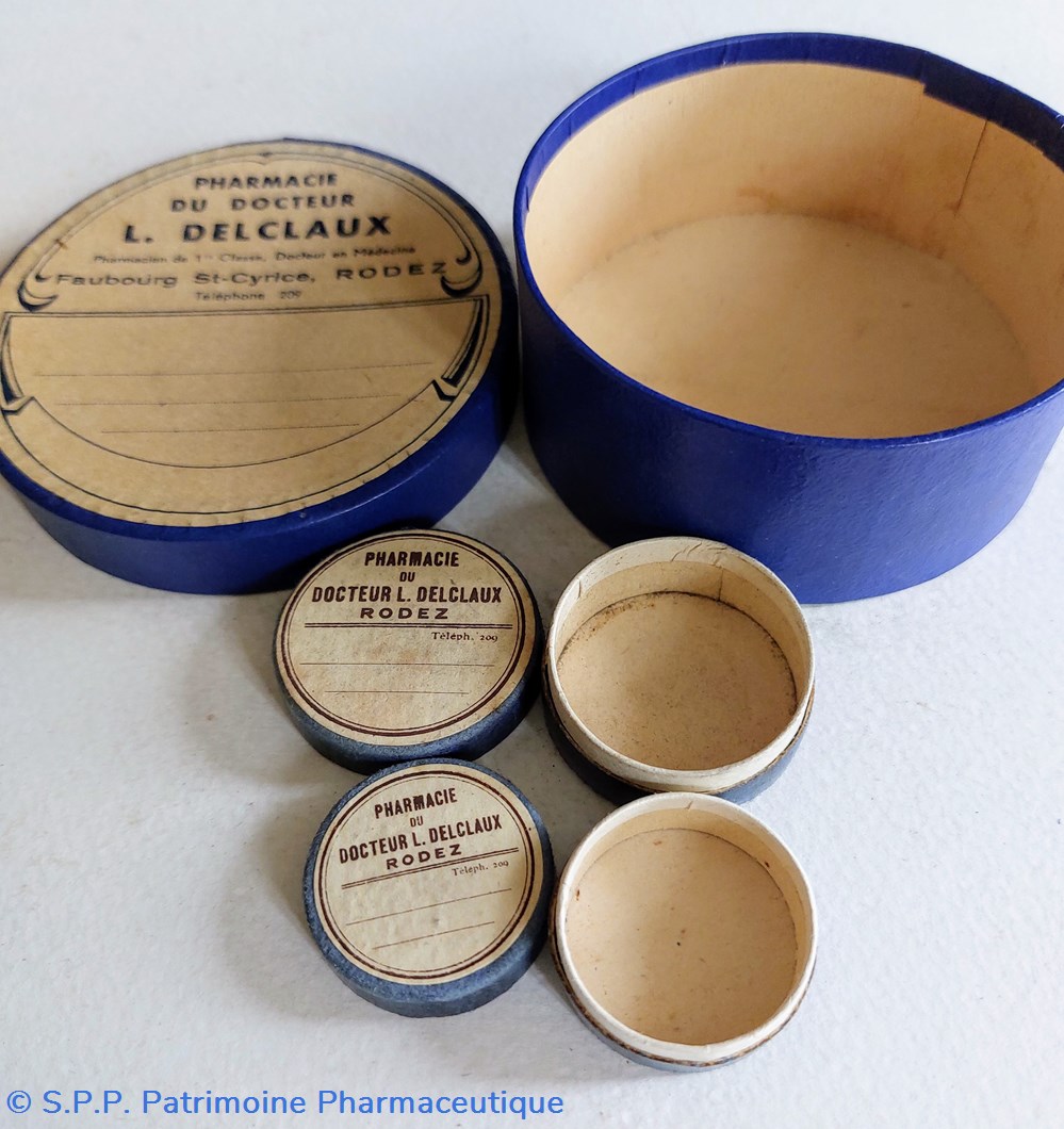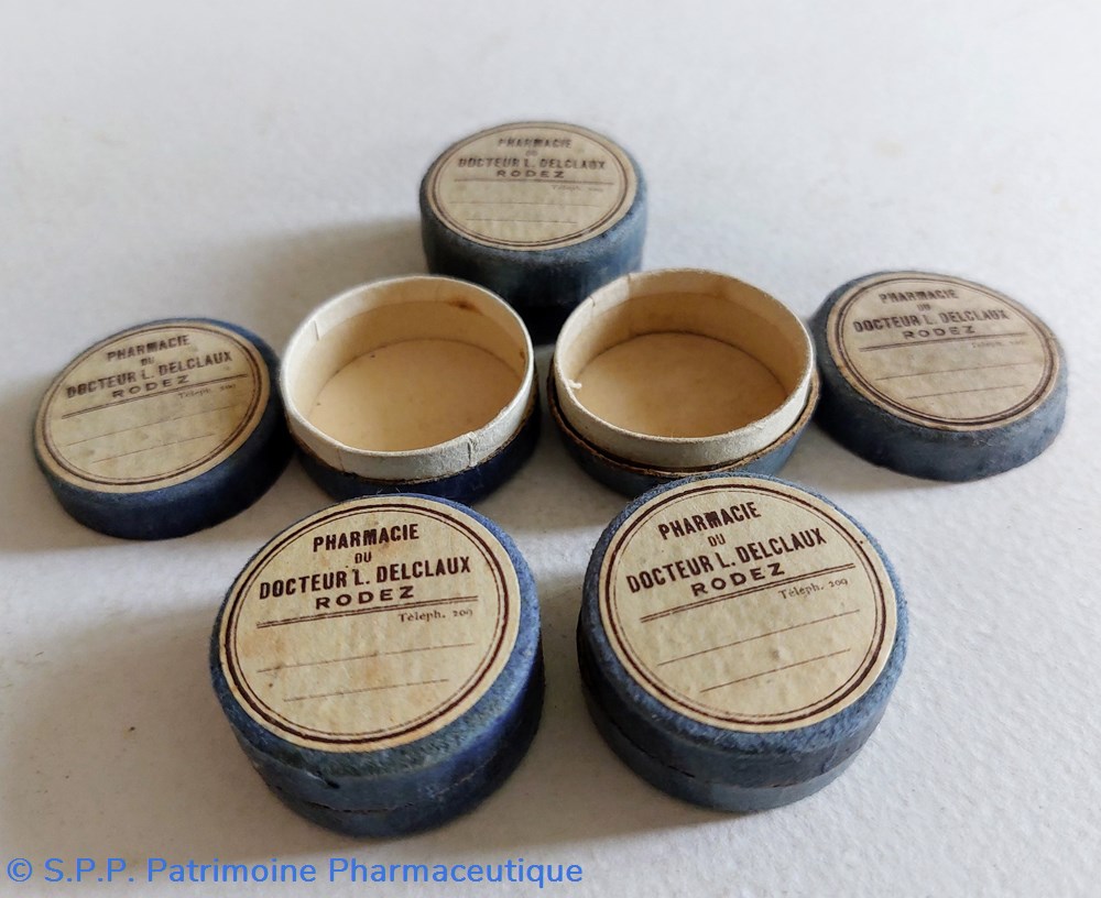 Sept Boîtes vides rondes en carton avec étiquette de la Pharmacie du Dr L. DELCLAUX ET à Rodez