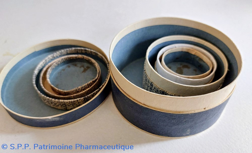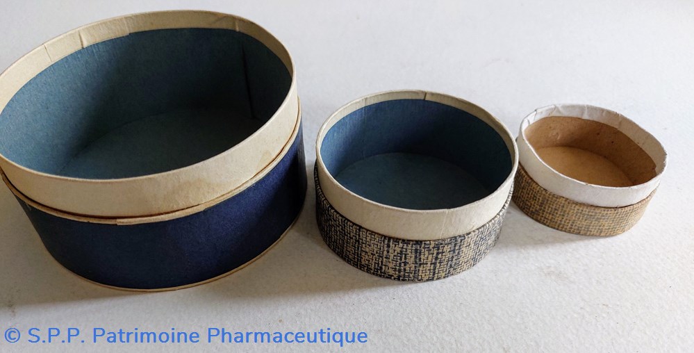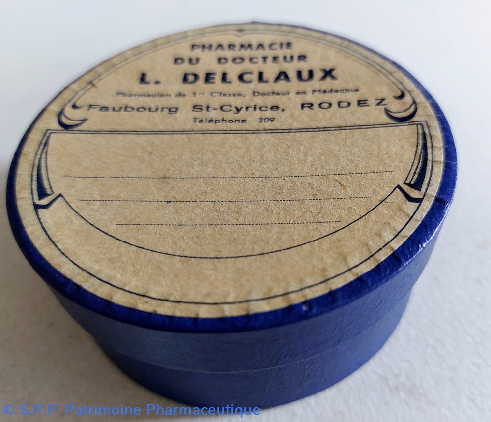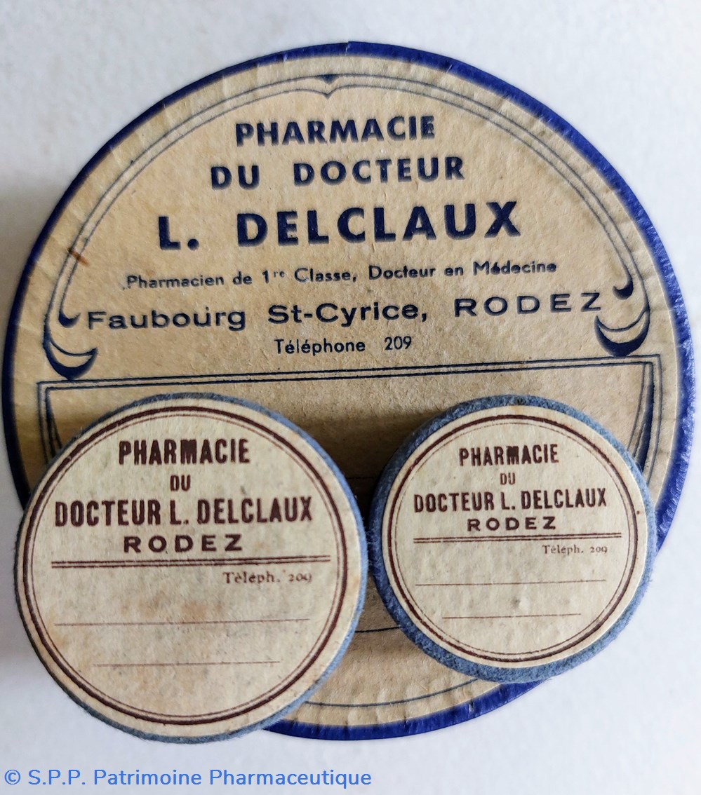 Sept Boîtes vides rondes en carton avec étiquette de la Pharmacie du Dr L. DELCLAUX ET à Rodez