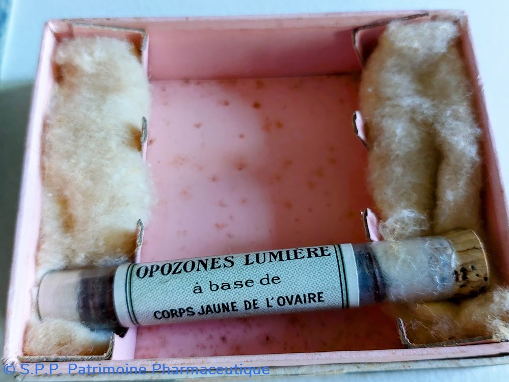 Coffret en carton 9.5*7.5*2.8 cm contenant un tube complet de comprimés (manque 2 tubes) D'OPOZONES LUMIÈRE à base de corps jaune de l'ovaire.