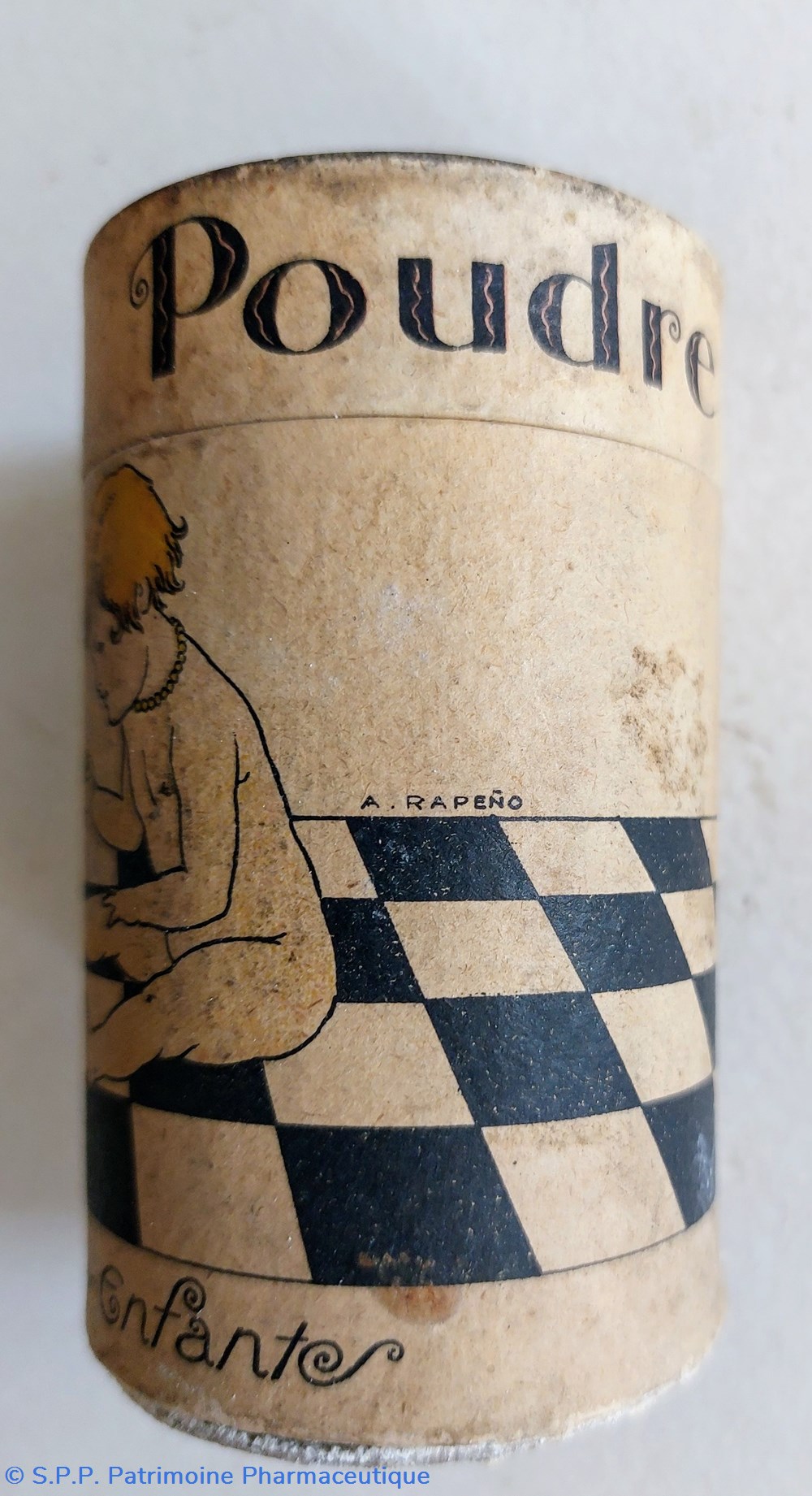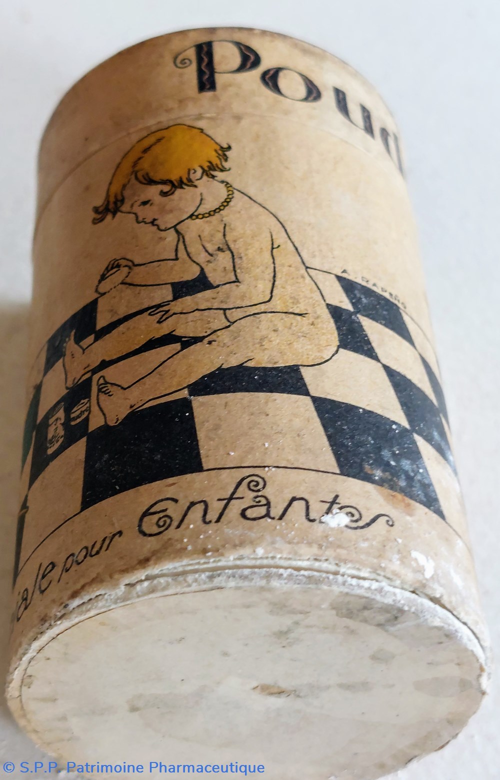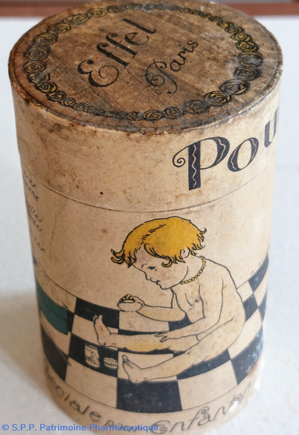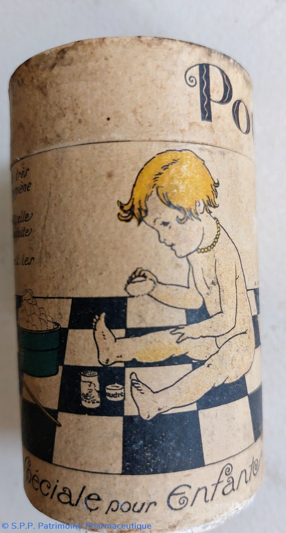 Boîte cylindrique remplie de poudre blanche ? (talc ?) pour enfants.