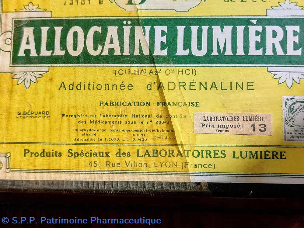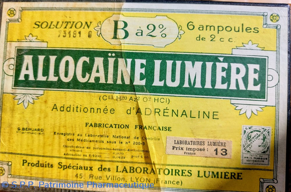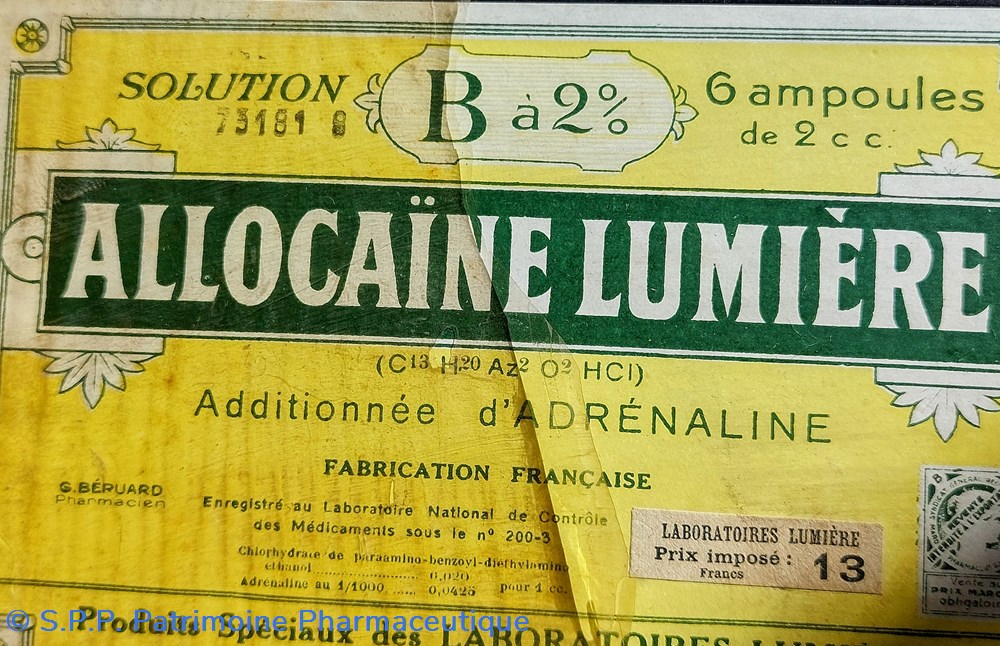 Coffret en carton (13 *9*2 cm) scellé d'origine sous cellophane contenant 6 AMPOULES de 2 cc Solution B à 2% ALLOCAÏNE LUMIÈRE additionnée D'ADRÉNALINE