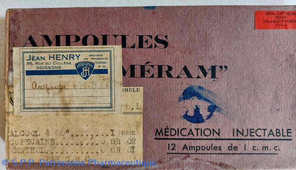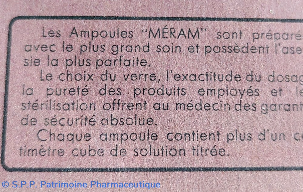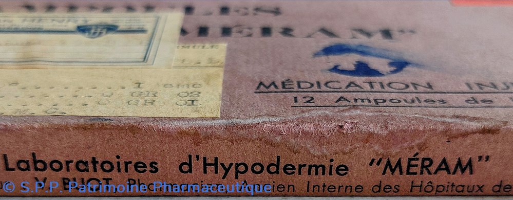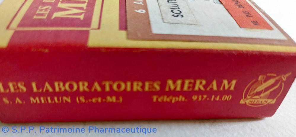 Boîte tiroir en carton 15*8*1.2 cm ayant contenu 12 Ampoules MERAM de 1 cc. Le coffret ne contient qu'une ampoule