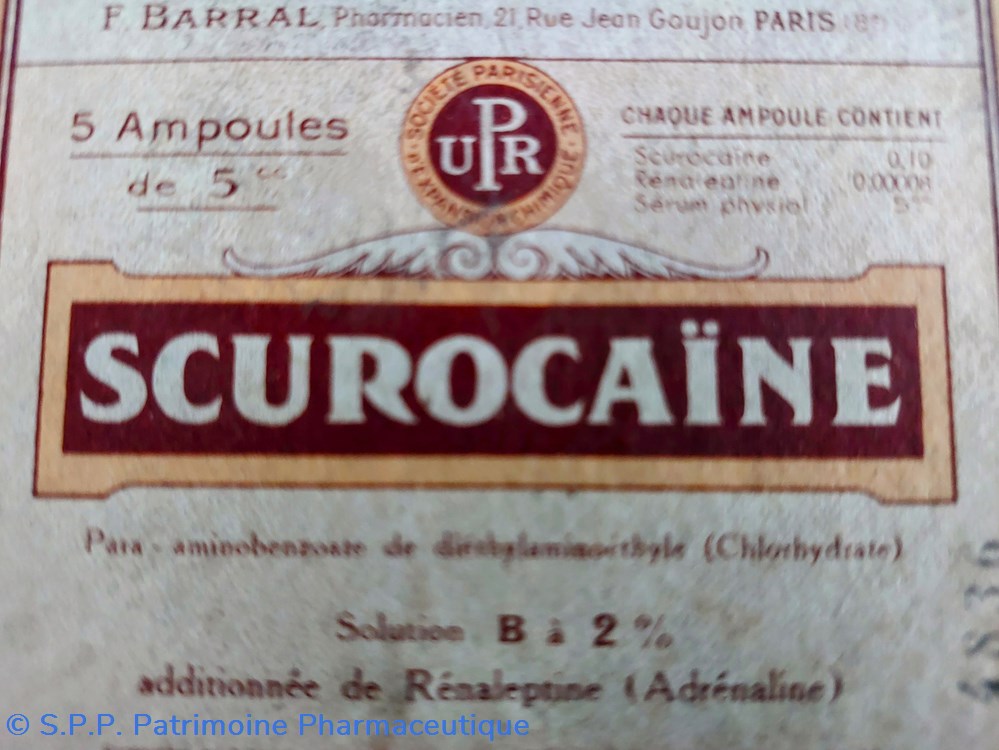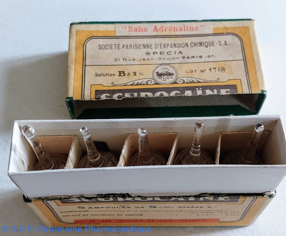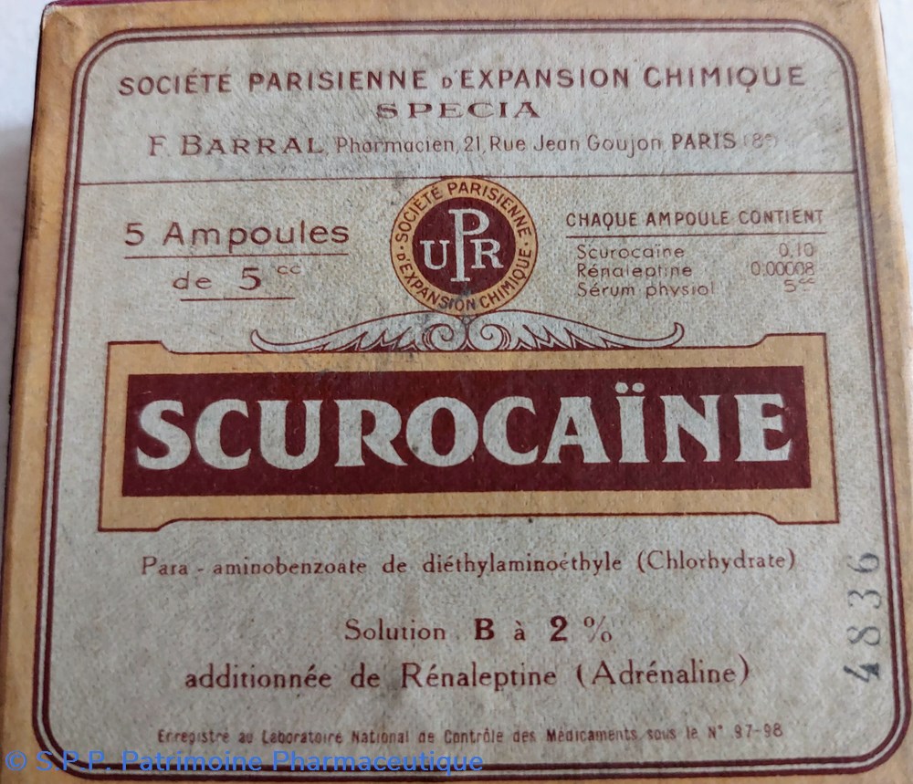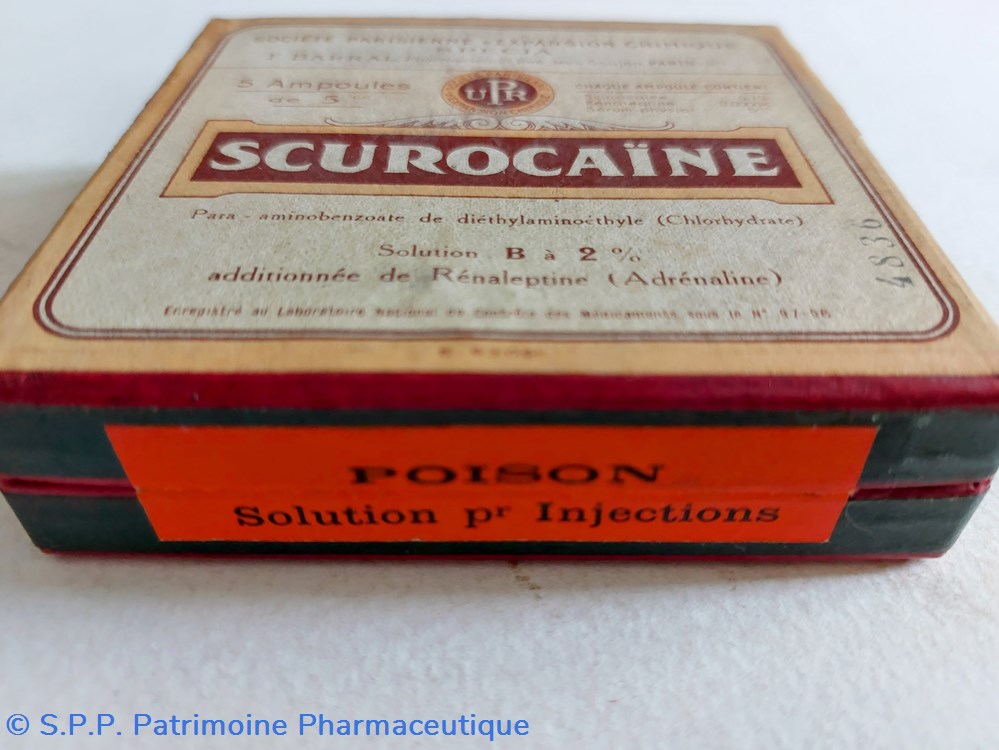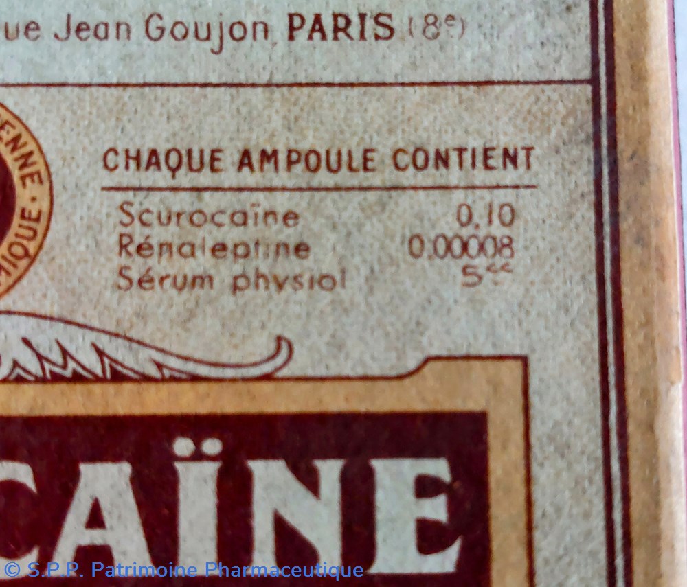Coffret en carton( 8.5*8*2 cm) ayant contenu 5 AMPOULES 5 Cm3 de SCUROCAÏNE additionnées de RENALEPTINE (adrénaline).