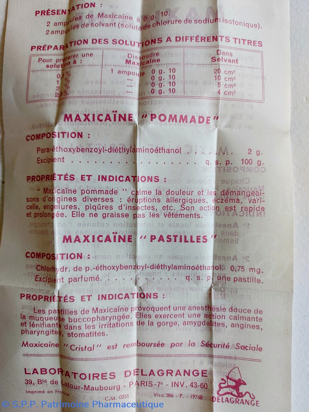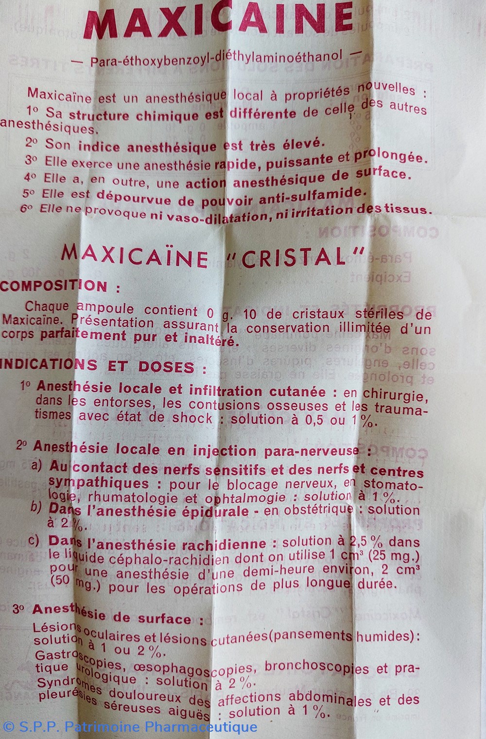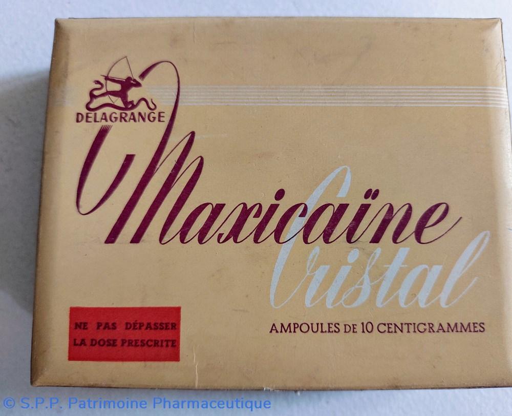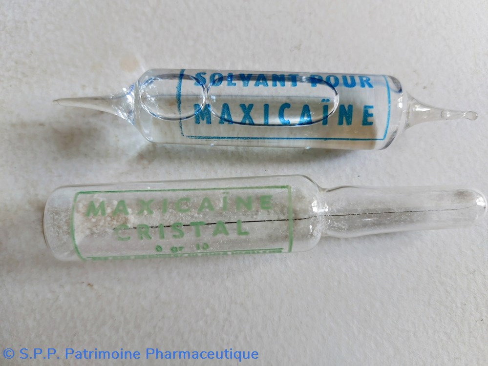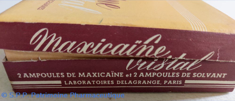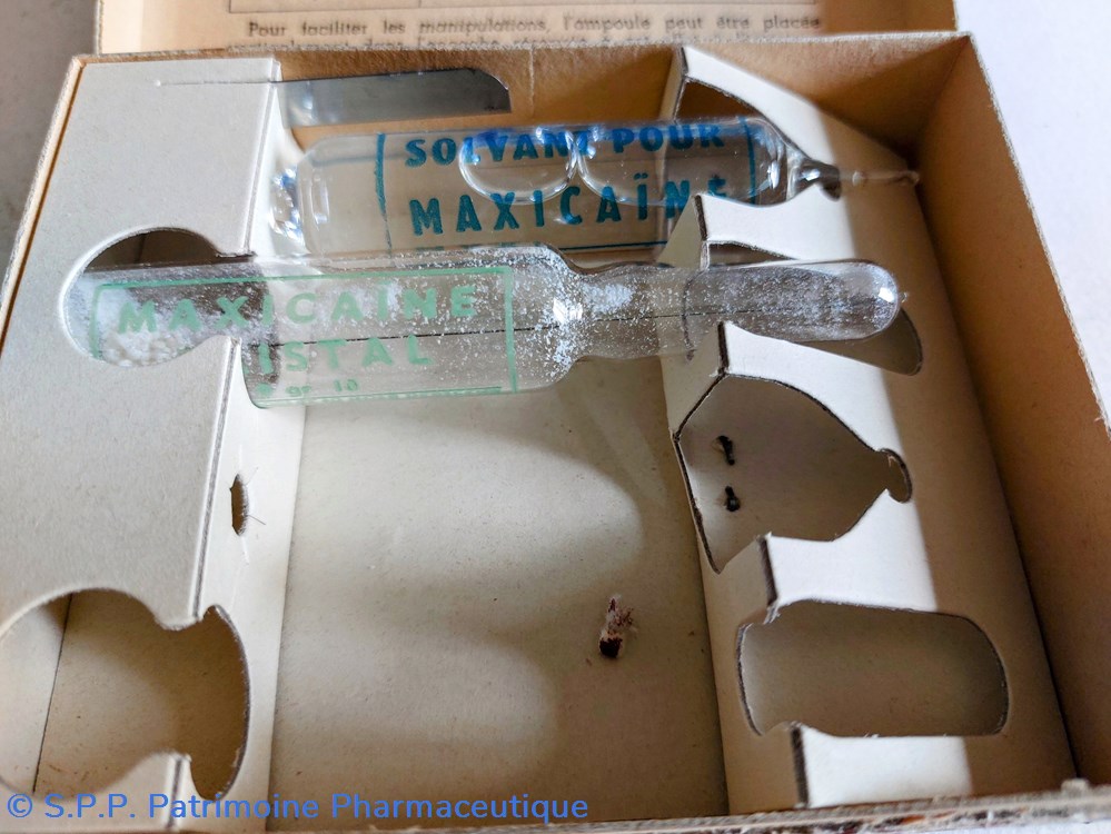 Coffret en carton (12*9.5 *2.5 cm) ayant contenu 2 Ampoules de MAXICAÏNE ( poudre 0.gr 10) et 2 Ampoules de solvant.