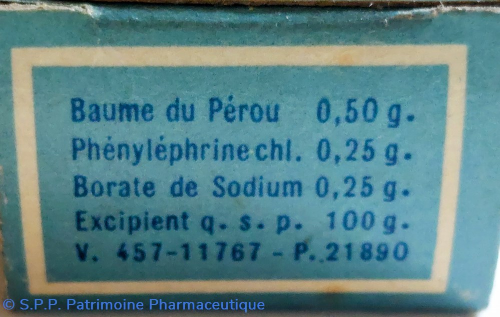 Formule : Baume du Pérou Chlorhydrate de Phényléphrine et Borate de Soude.