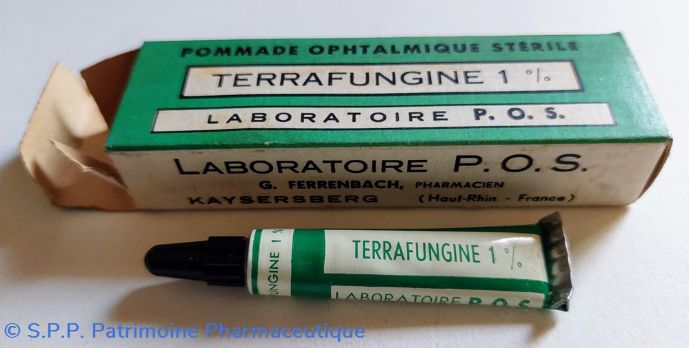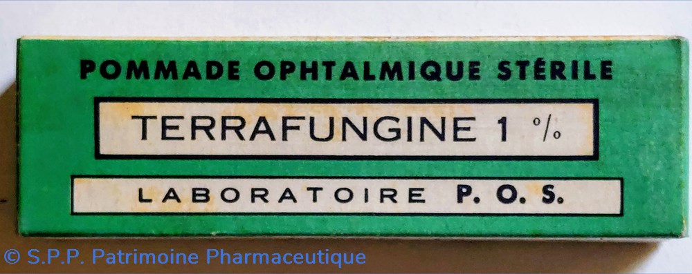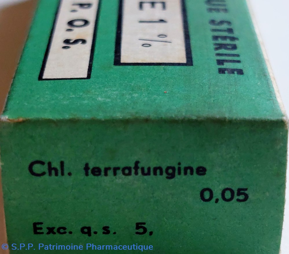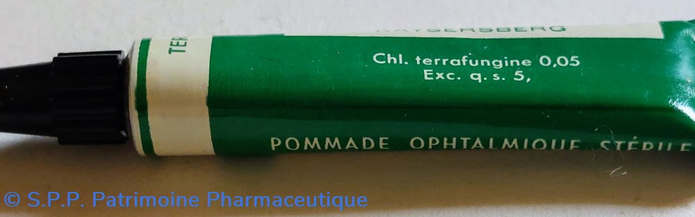Dans un emballage en carton, Un petit tube (7 cm) contenant de la pommade OPHTALMOLOGIQUE STÉRILE - CHL. TERRAFUNGINE 1%