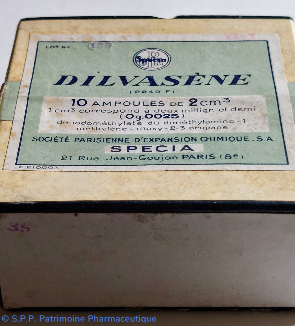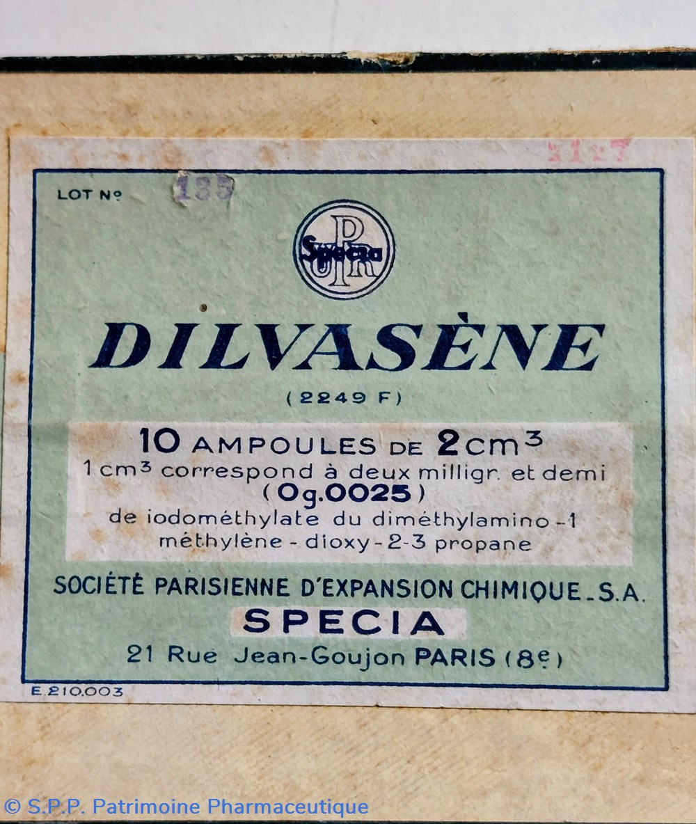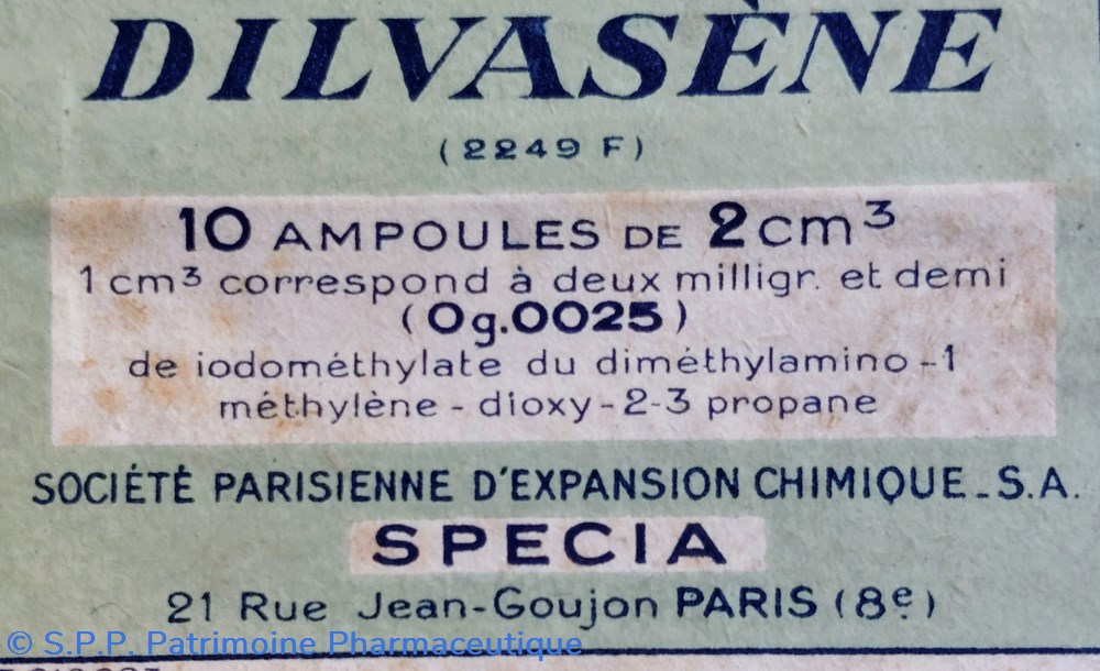 10 Ampoules de 2 cm3 de DILVASÈNE correspondant à 0.0025 G. de iodométhylate du diméthylamino, Méthylène, Dioxy 2-3 Propane