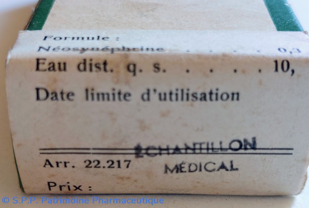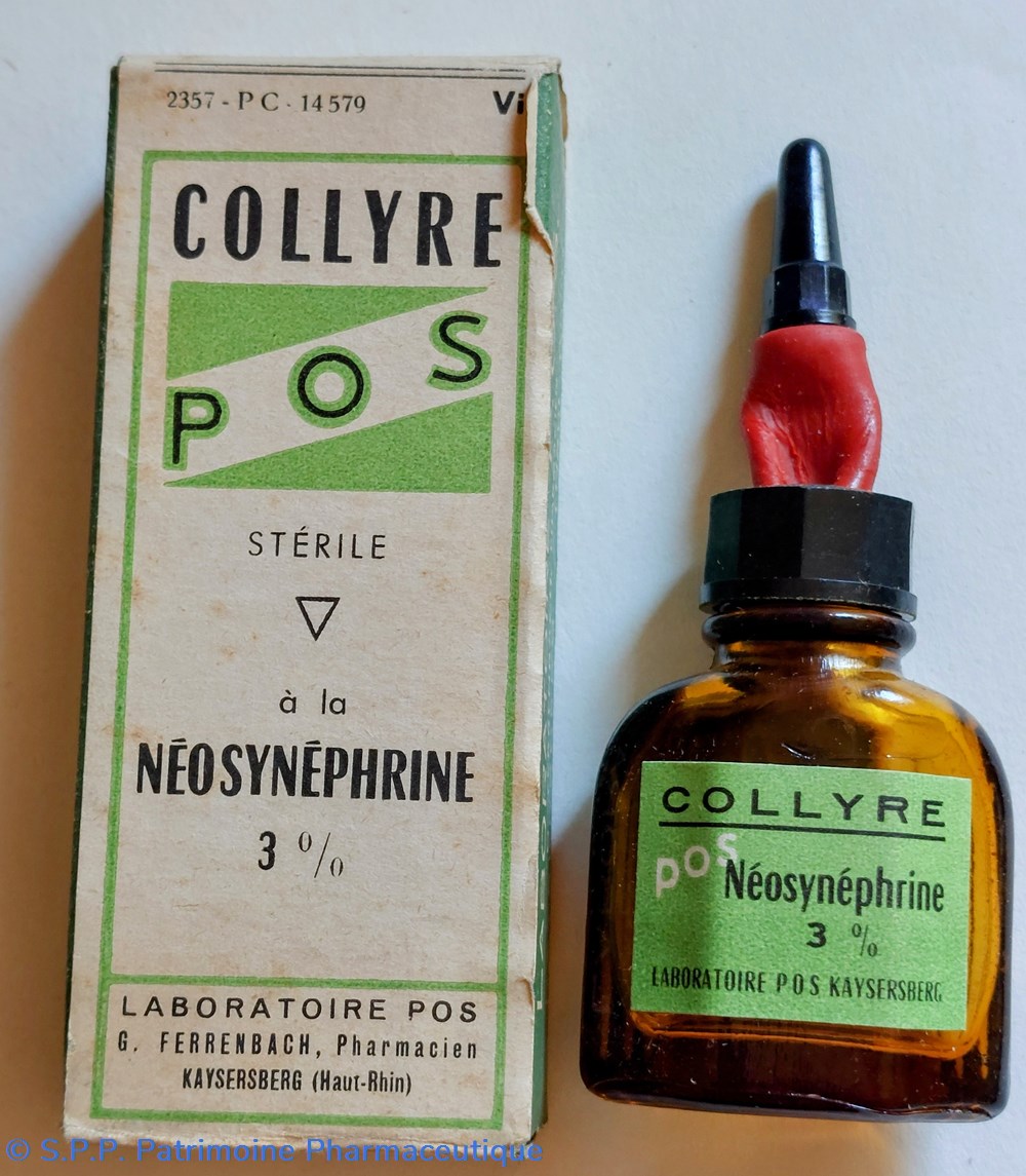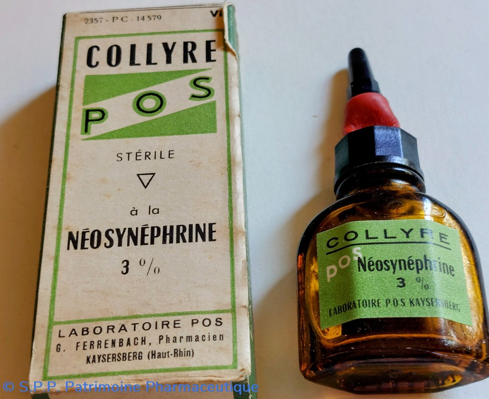 Dans un emballage en carton, Petit vide en verre ambré, un flacon avec compte gouttes DE COLLYRE STÉRILE NÉOSYNÉPHRINE 3%