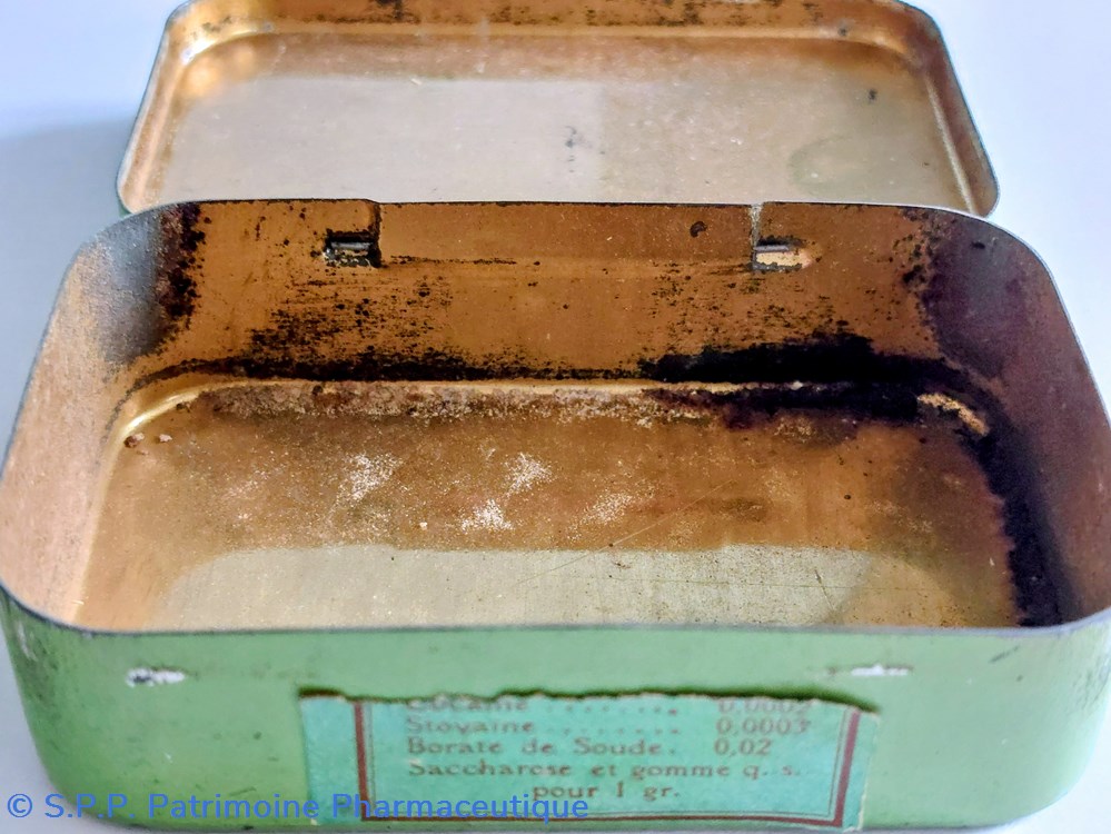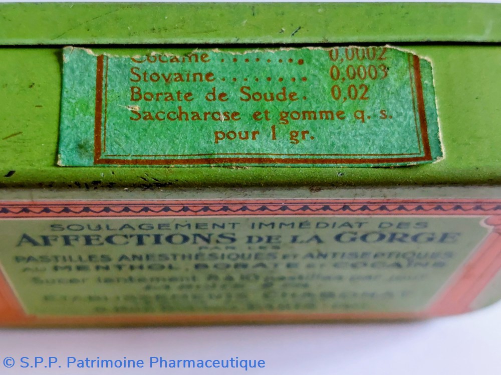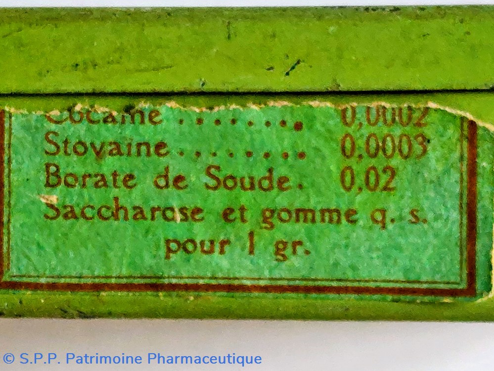 Formule : Cocaine, Stovaine,Borate de soudeet Saccharose et gomme.