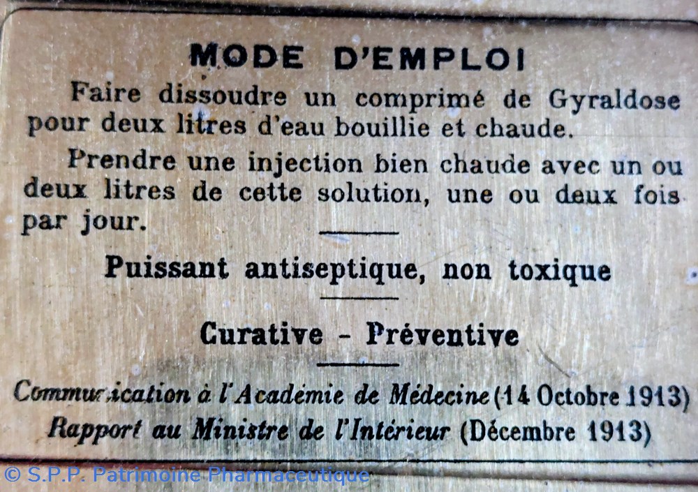 " pour l'hygiène féminine et la toilette des dames" à base de Pyolisan, d'acide thymique et de Trioxyméthylène. Utilisation par injection - Puissant antiseptique non toxique - Action curative et préventive.