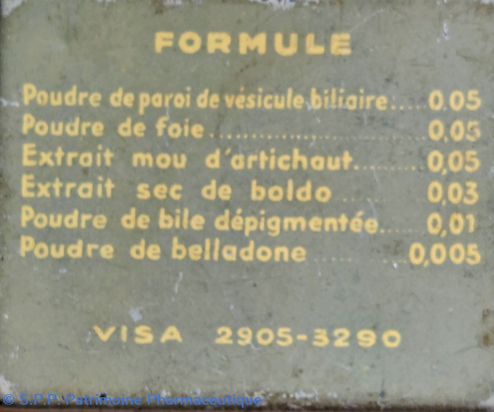 Formule : Poudre de paroi de vésicule biliaire - Poudre de foie- Extrait mou d'artichaut - Extrait sec de boldo - Poudre de bile dépigmentée - Poudre de belladone.