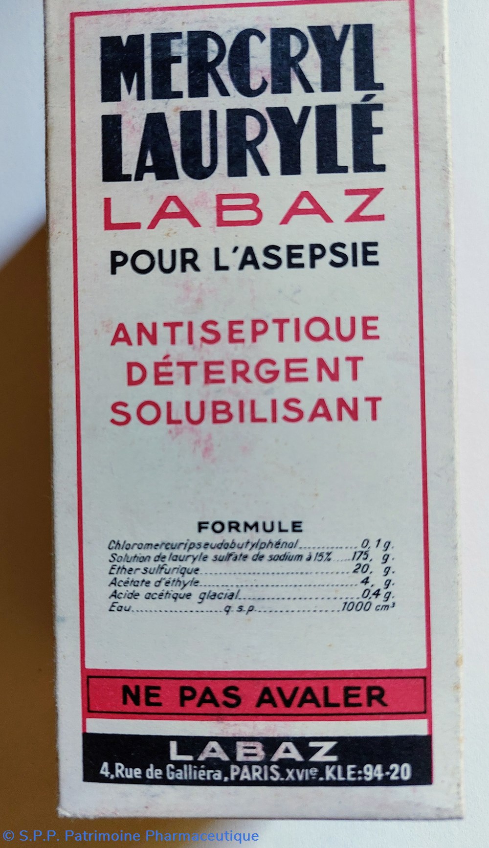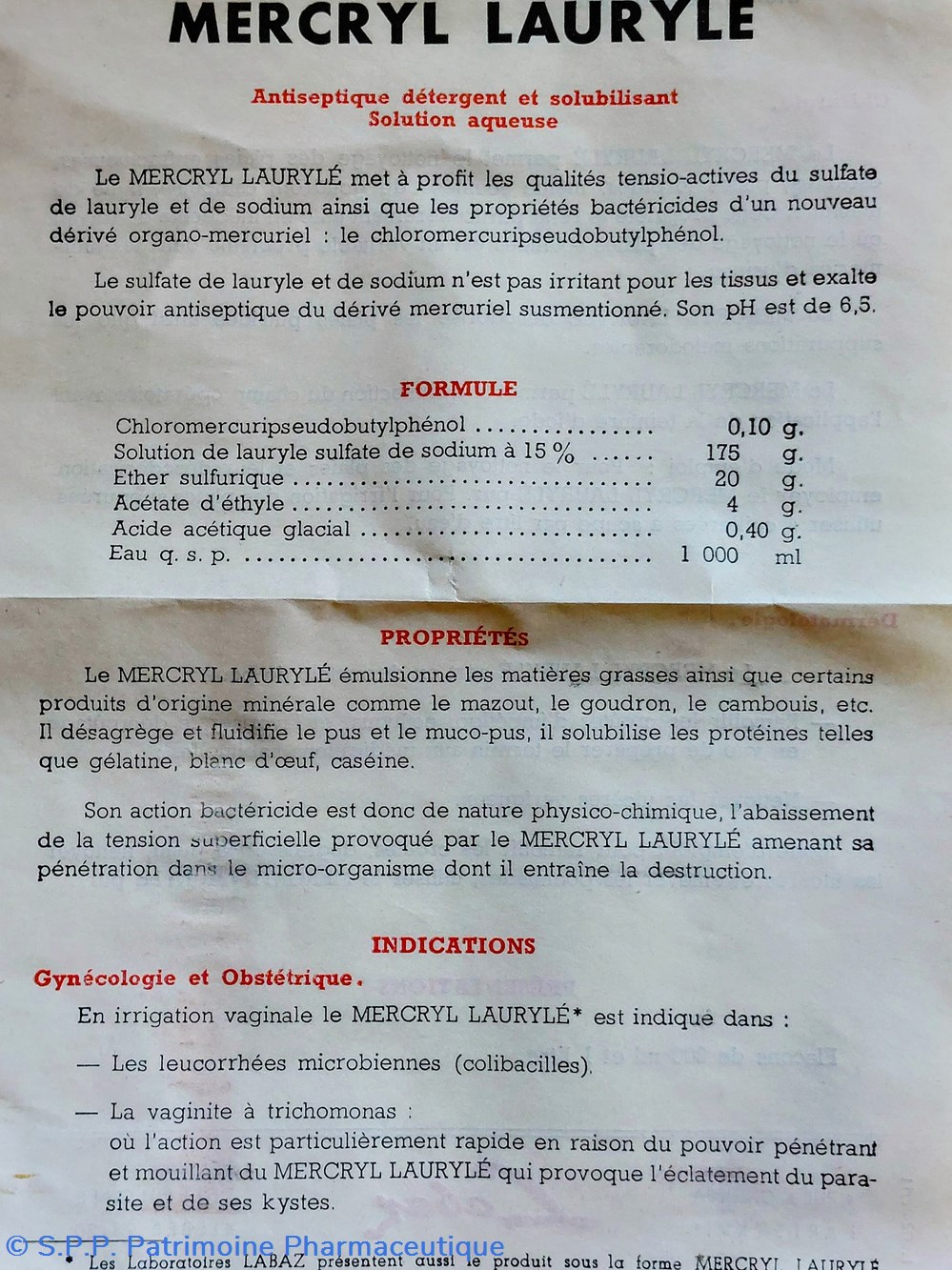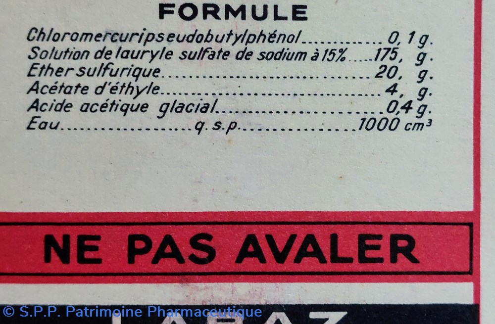 Formule : Chloromercuripseudobutylphenol Solution de LAURYLÉ Sulfate de Sodium Éther sulfurique Acétate d'éthyle Acide acetique glacial et eau.