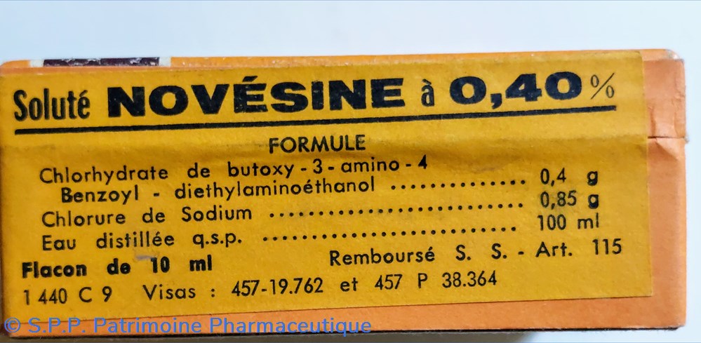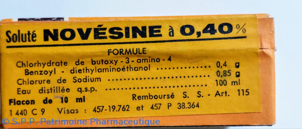 Soluté NOVESINE à 0.40% : Chlorhydrate de butoxy Benzoyl, diethylaminoéthanol, Chlorure de Sodium et eau distillée .