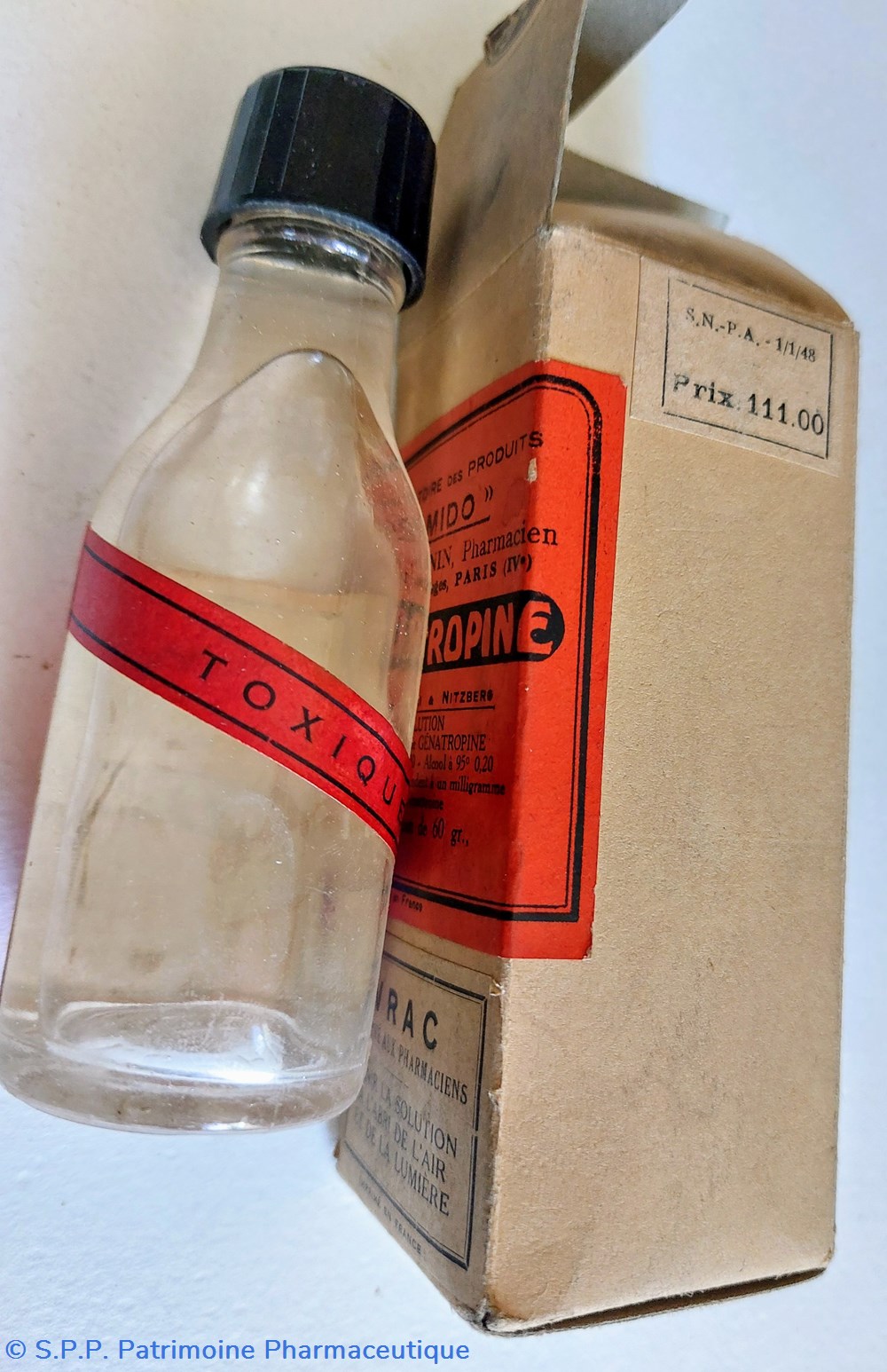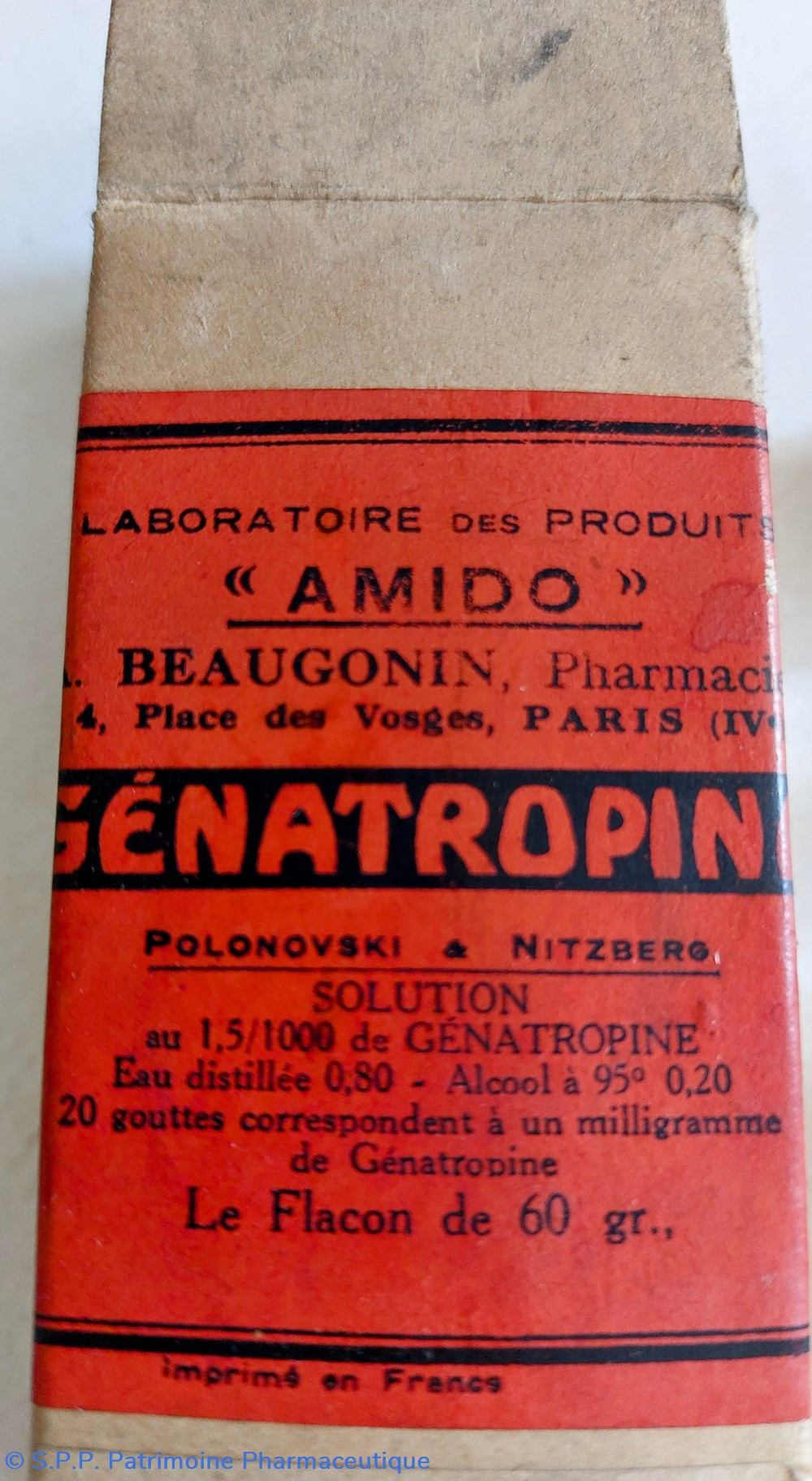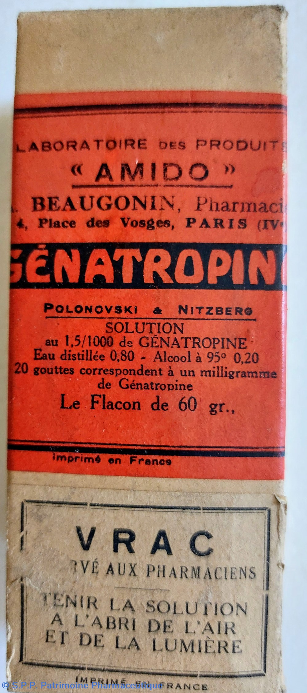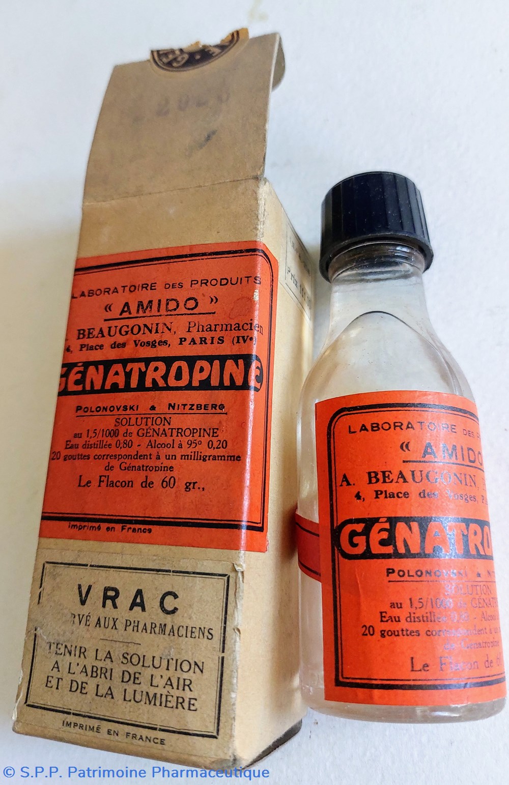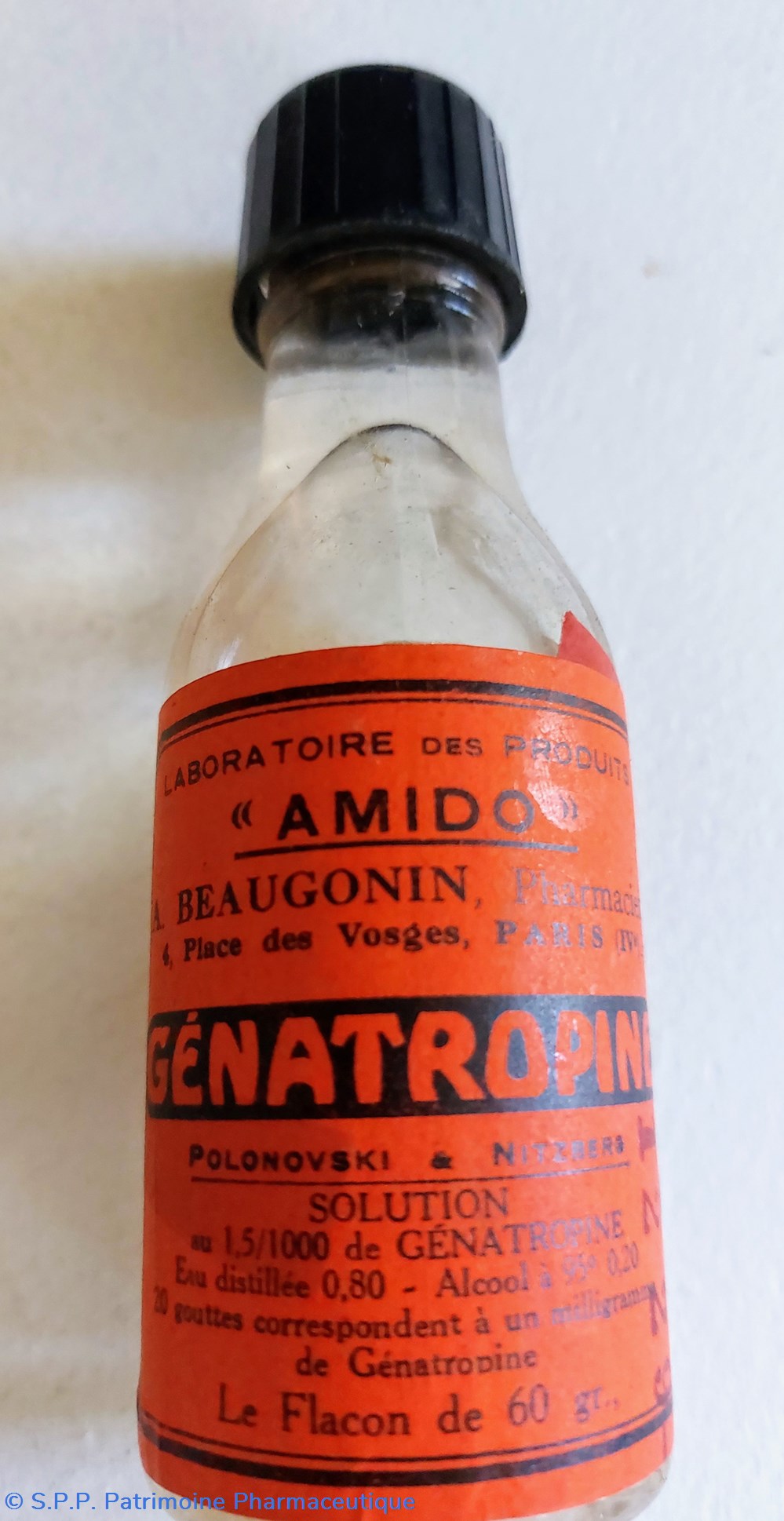 Flacon en verre ambré contenant 60 gr. de Solution à 1.5 /1000 de GÉNATROPINE Eau distillée Alcool à 95