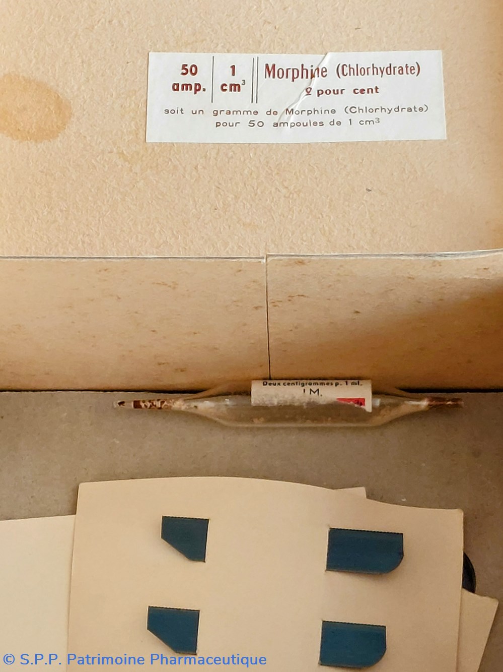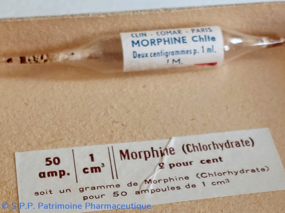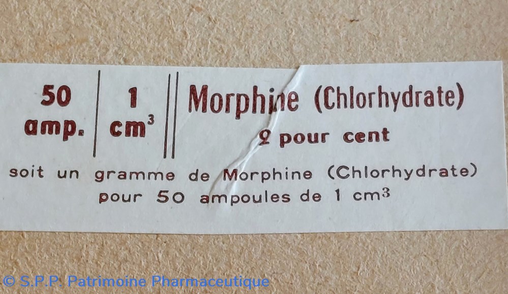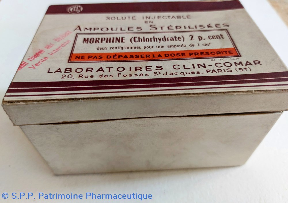 Coffret en carton 11 * 7.5cm hauteur 6.5 cm. Reste une ampoule vide de morphine.