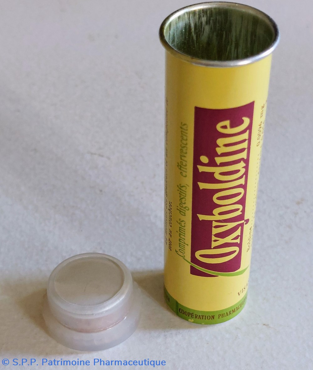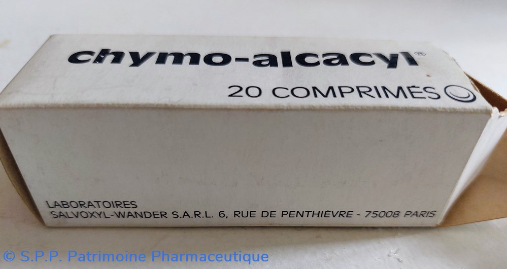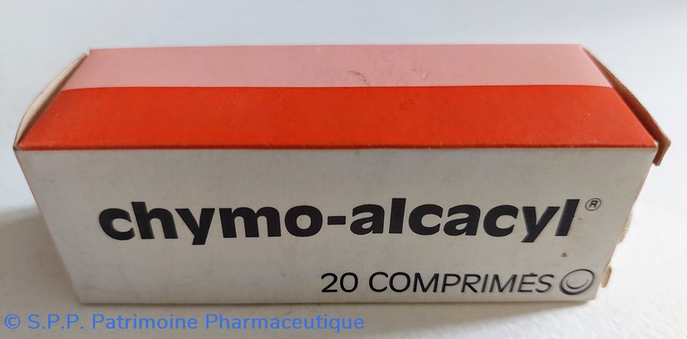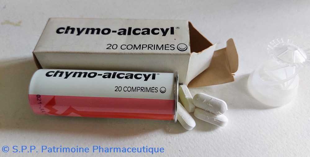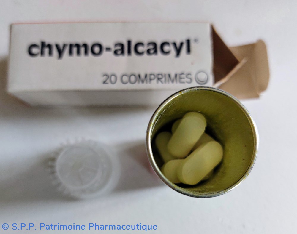 Tube métallique hauteur 8.5 diamètre 2.5 cm contenant des comprimés de CHYMO- ALCACYL