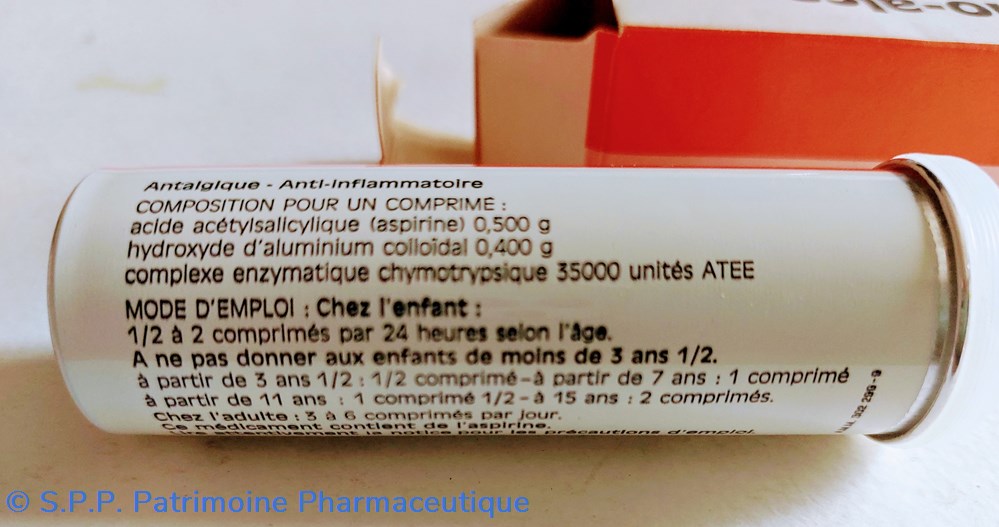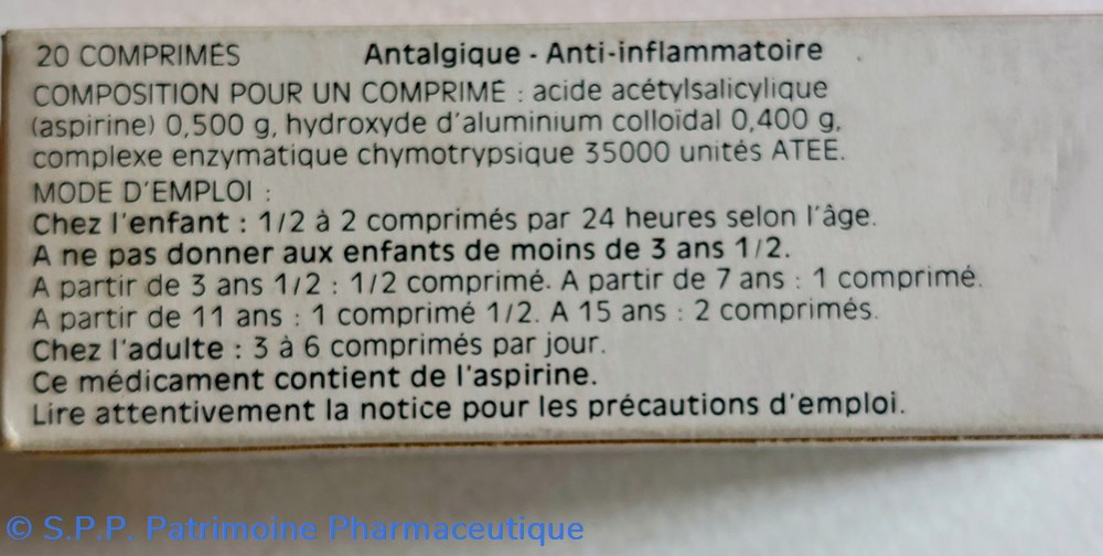 Composition : Acide acetylsalicylique Hydroxyde d'aluminium colloïdal Complexe enzymatique Chymotrypsique.
