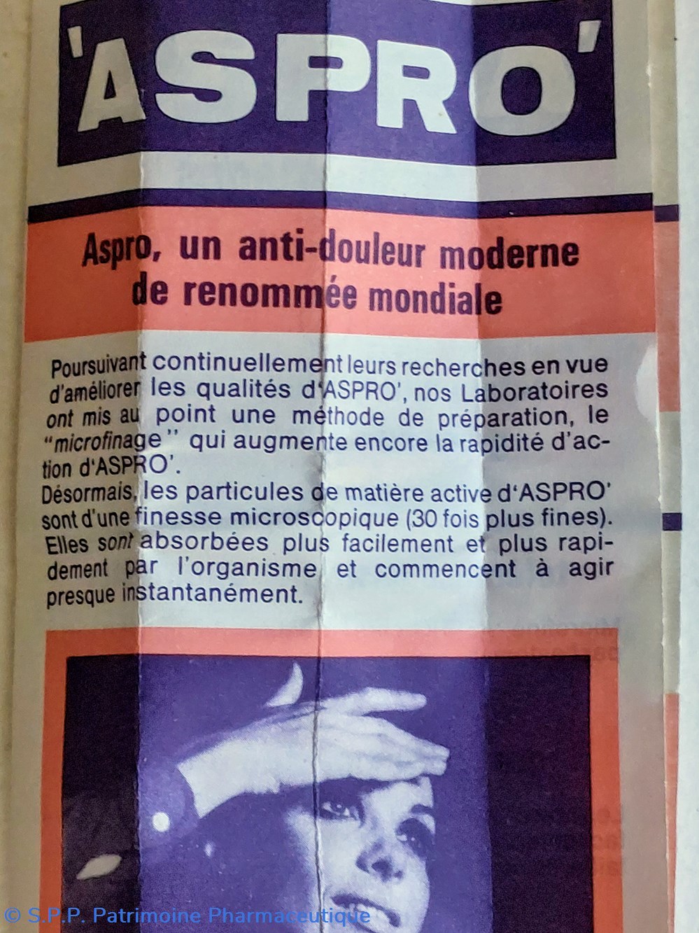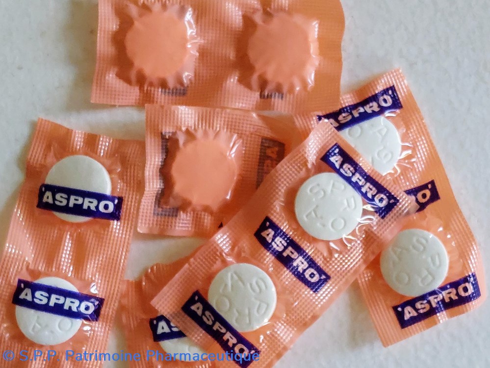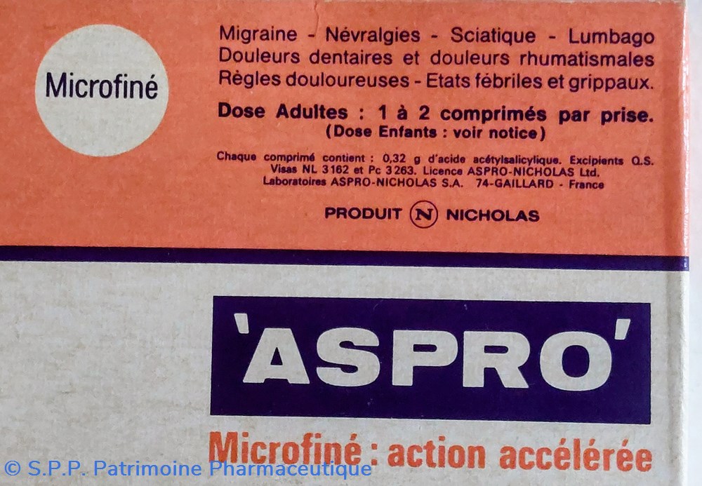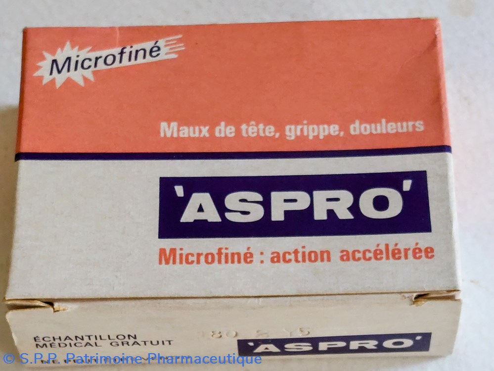 Boîte contenant des comprimés ASPRO Microfiné (7*5.3 *2 cm) conditionnements individuels.
