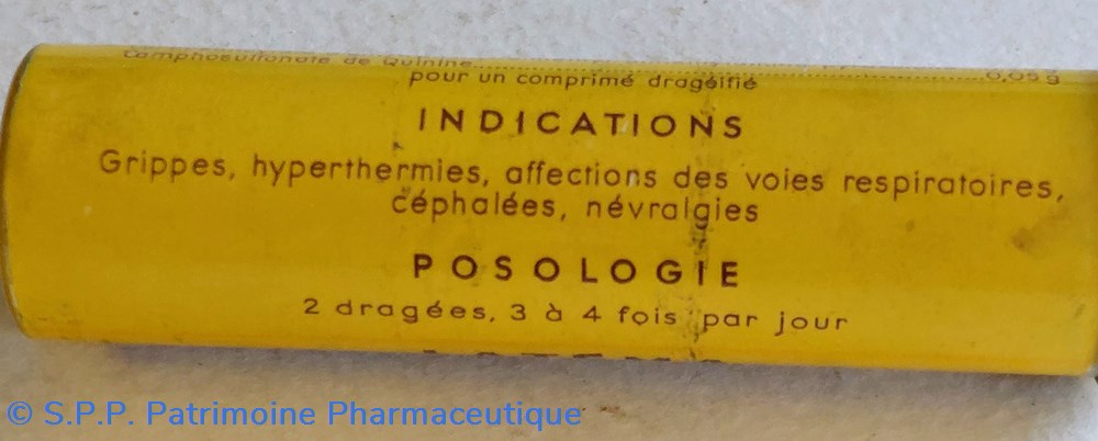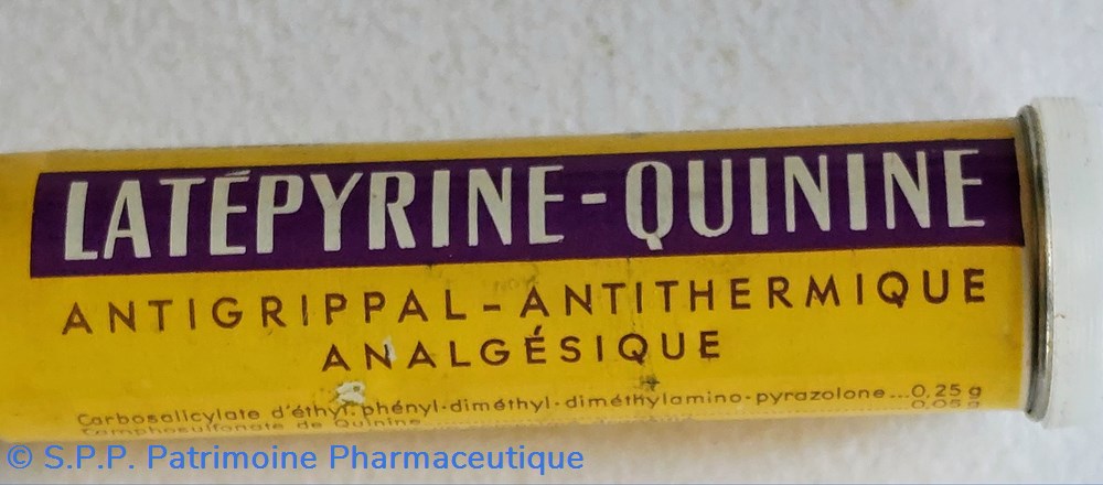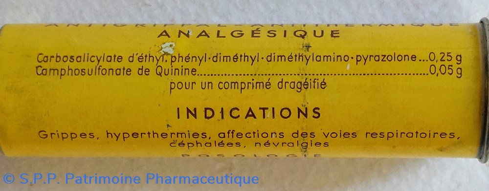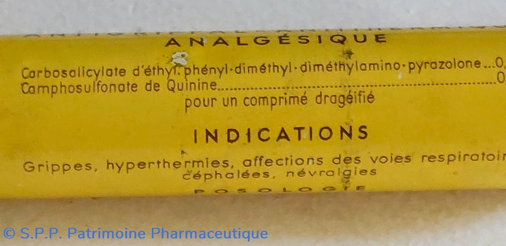 Formule : Carbosallicylate d'ethyl Phenyl-dimethyl dimethylamino Pyrazolone et Camphosulfonate de Quinine.