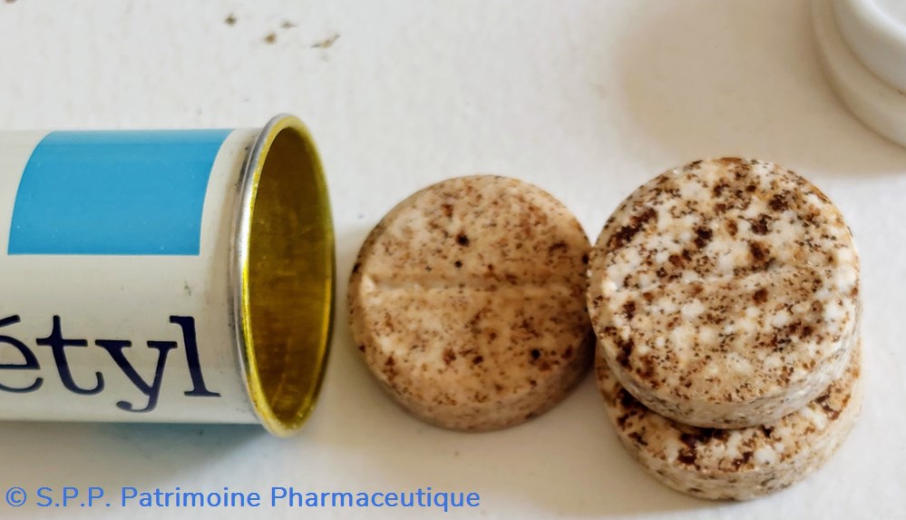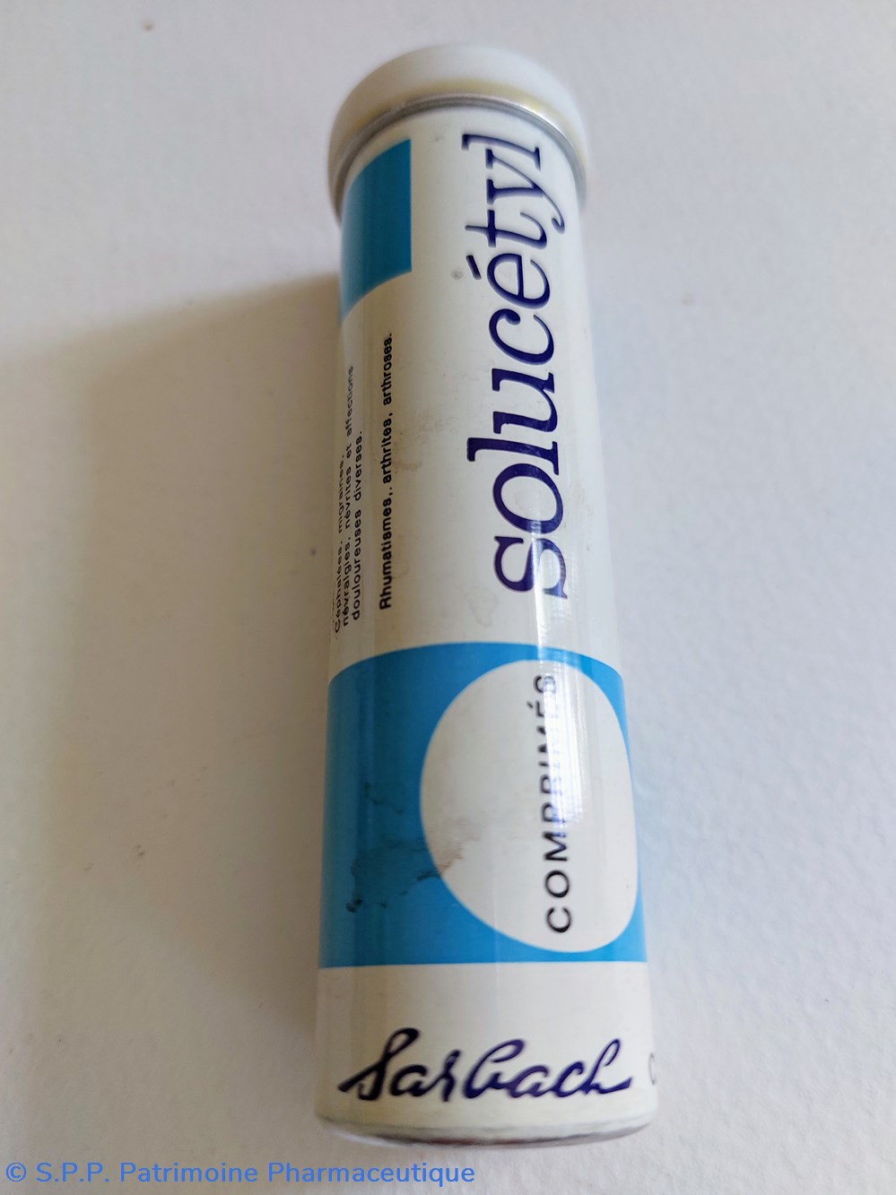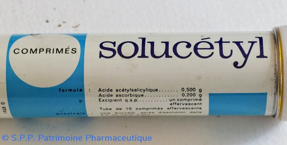 Tube métallique hauteur 10 cm Diamètre 2.5 cm contenant pour moitié des comprimés effervescents SOLUCÉTYL