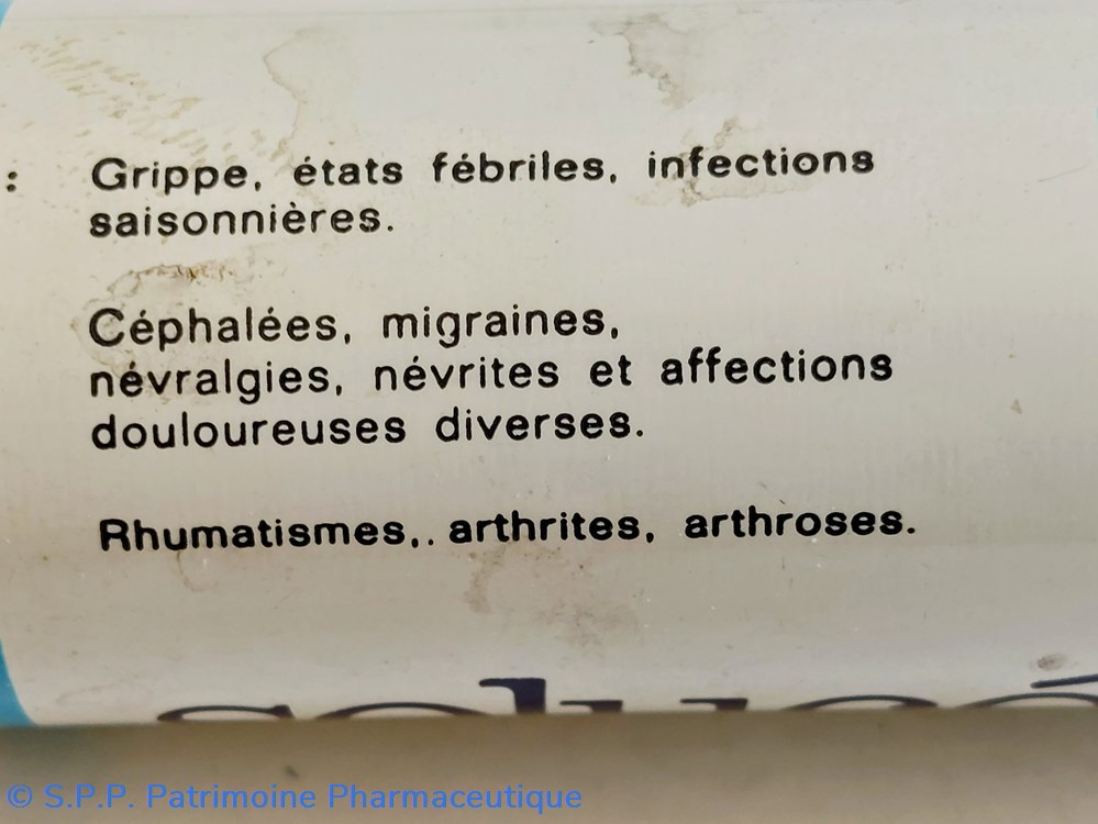 Pour :grippe États febriles, névralgies, névrites, et affections douloureuses diverses. Rhumatismes arthrites et Arthroses.