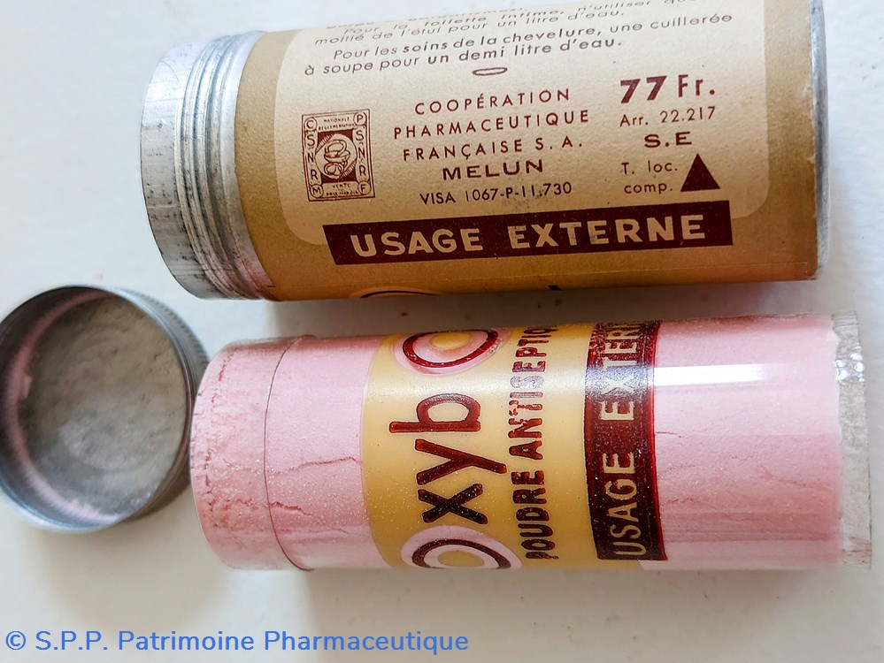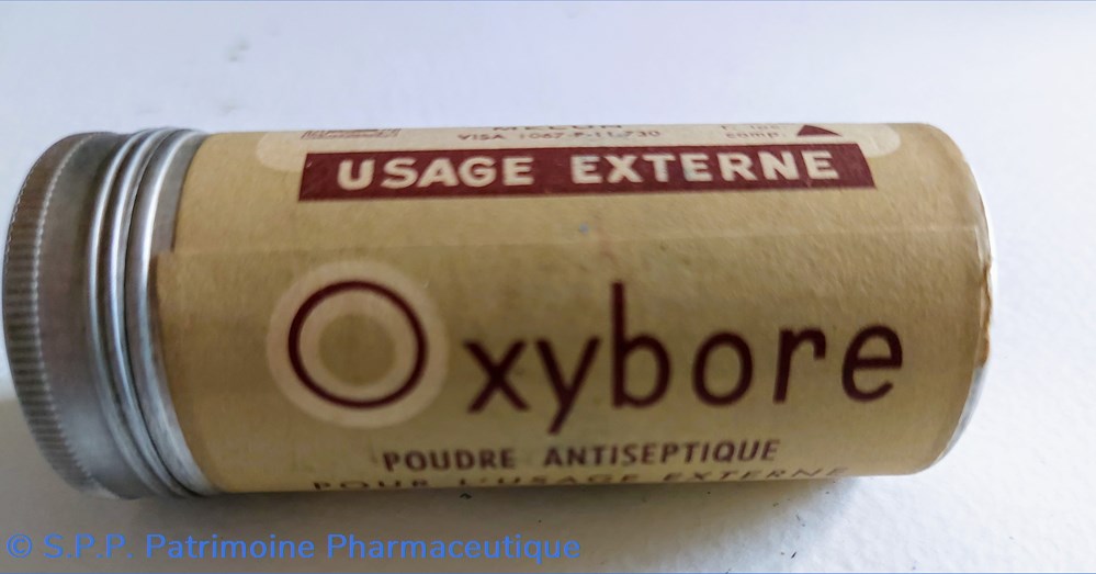 Tube métallique hauteur 7 cm Diamètre 3 cm. Contenant de la poudre antiseptique OXYBORE pour usage externe.
