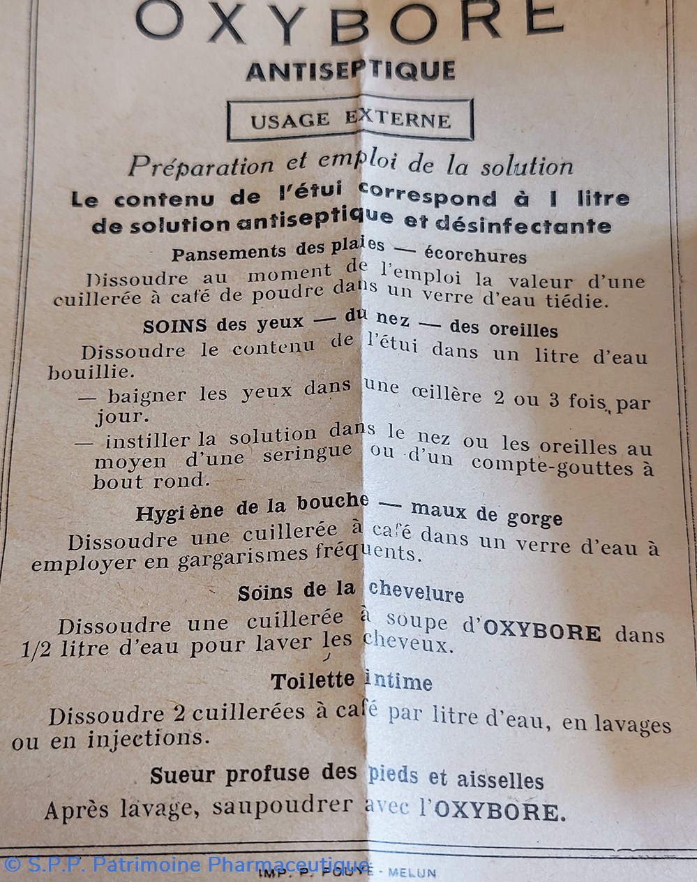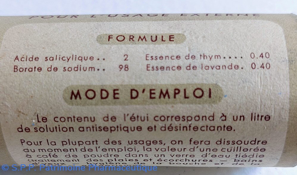 Pour traitement des plaies écorchures bains d'yeux, hygiène de la bouche et de la gorge, gargarismes. Toilette intimes et soins de la chevelure.