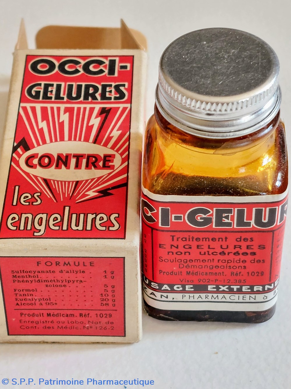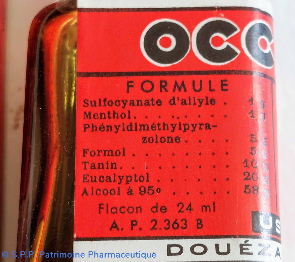Formule sulfocyanate d'allyle, les Menthol. Phenyldimethylpyrasolone. Formol, Tanin. Eucalyptol. Alcool à 95.