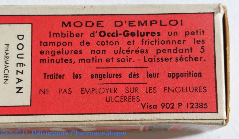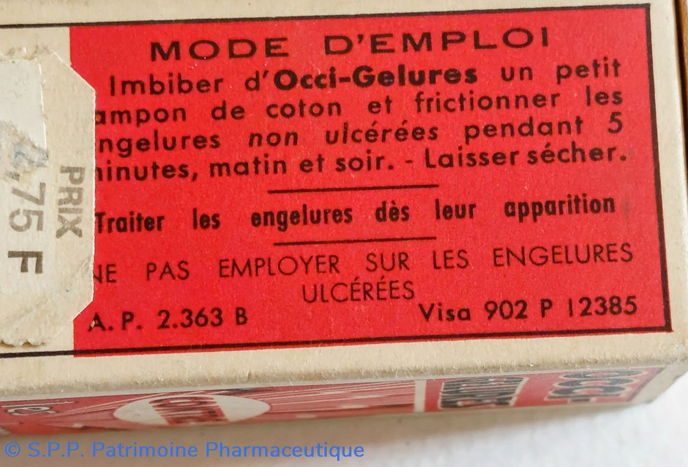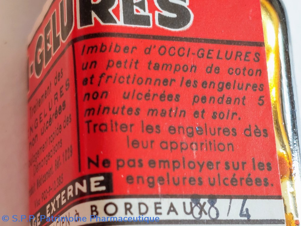 Petit flacon en verre base carrée 3 * 3 hauteur 6 cm contenant pour moitié un liquide marron pour traitement des engelures non ulcerées.